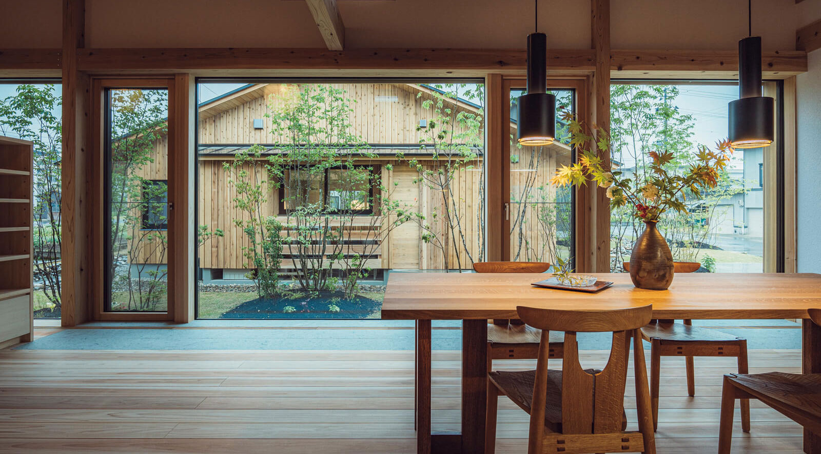 室内外の現しの構造材の美しさは、木を適切に扱える大工の技があってこそ。秋田杉を積極的に活用することは、心豊かな住空間をつくることはもちろん、秋田の森林保全や次世代への大工技術の継承、資材の運搬にかかるエネルギーやコストの削減など、多方面に好影響を及ぼす。