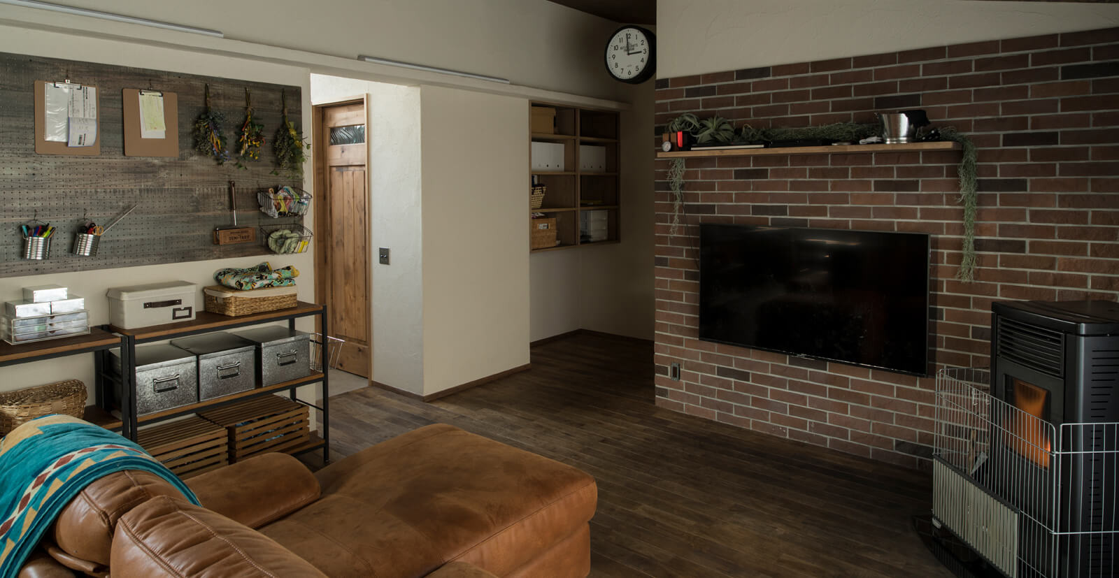 奥さんの理想の住まいの原点は、レンガ壁と炎の見える実家のリビングにあるといいます。新築を決めたときから、ランニングコストと使い勝手、メンテナンスのしやすさを考え、暖房にはペレットストーブを採用したいと考えていました。そして、ストーブの熱を利用して温水セントラル暖房もできるイタリア製のペレットストーブを見つけ、大元社長に設置を相談しました。