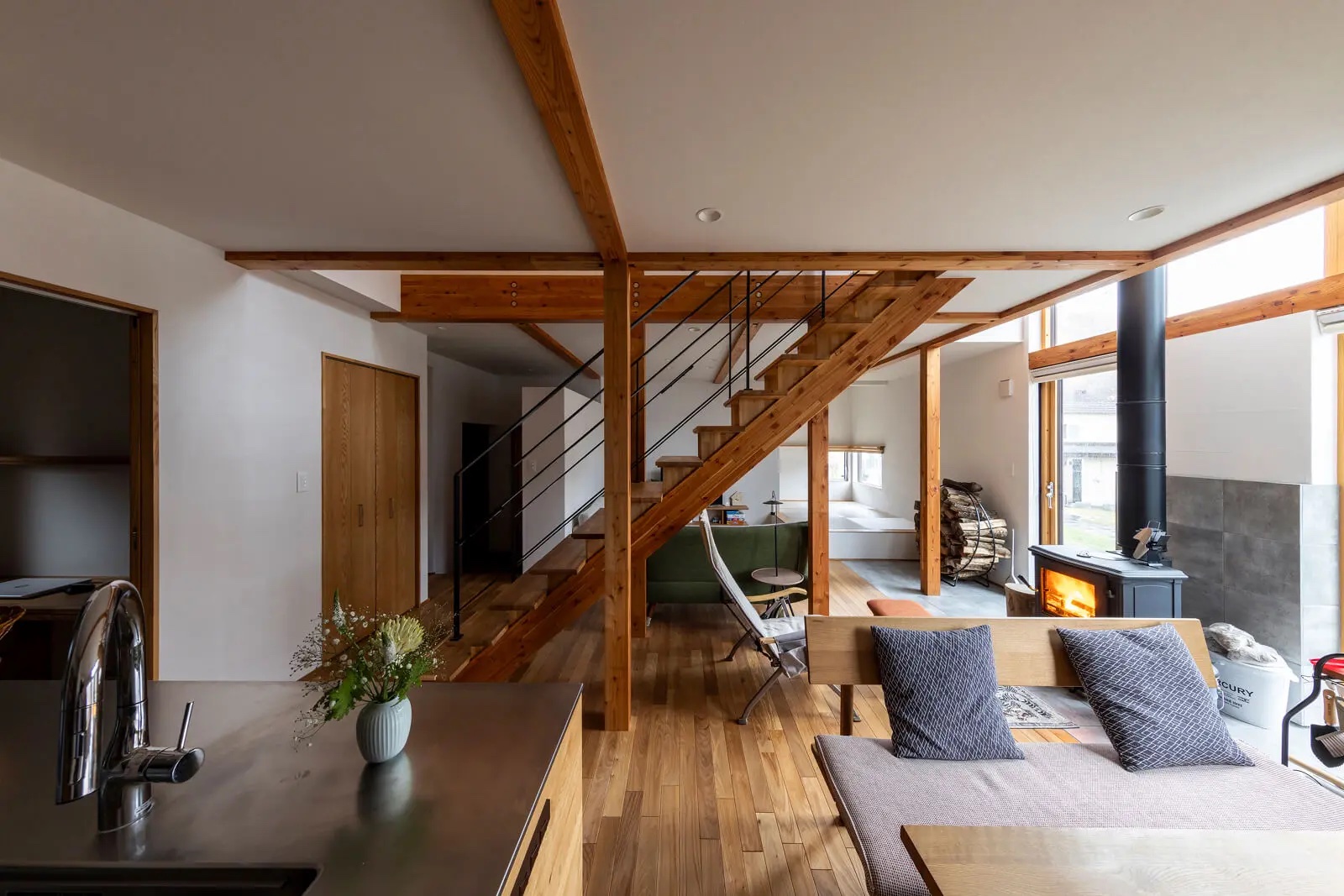 フルオーダーキッチンと薪ストーブが主役の暮らしやすさも備えた家