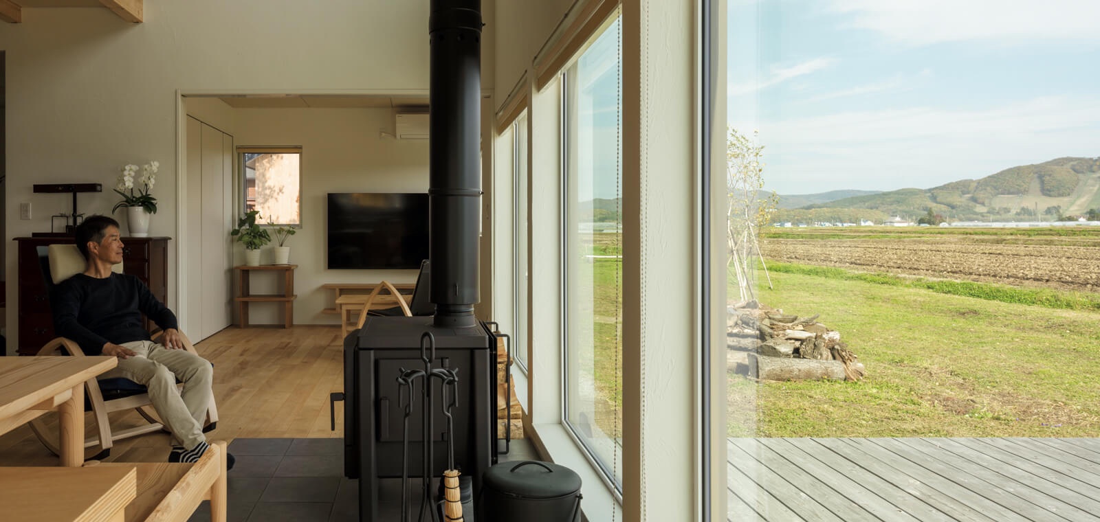 2023年11月に完成した新居は片流れ屋根の2階建て。1階にLDK、2階には2つの個室を配しています。吹き抜けのあるリビングは大開口から景観をパノラマに呼び込む開放的な空間。冬は窓辺に設けた薪ストーブの炎と雪景色が、暮らしをより豊かに演出します。なかでもWさんが気に入っているのは、2階の渡り廊下。2つの個室を結ぶ渡り廊下がブリッジのように吹き抜けを走る様は、「自分たちでは想像できなかったプランです」と、太田さんの設計力を改めて実感することができたと語ります。