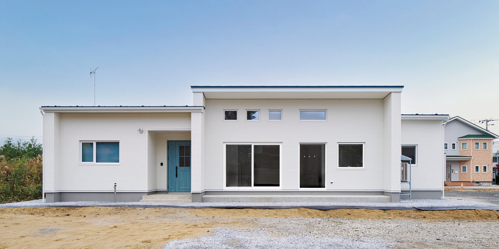 完成した住まいは南面に大きな開口がある平屋。以前の賃貸も平屋で、無駄がないフラットな動線が気に入っていたそう。間仕切りの少ない開放的な間取りとUA値0.21、C値0.30の高い住宅性能というご夫妻の希望も備えています。団らんの場であるリビングまわりは家族が集まりやすい工夫が詰め込まれており、隣にある多目的スペースはくつろいだり遊んだりするだけでなく、造作カウンターで勉強や仕事もできます。