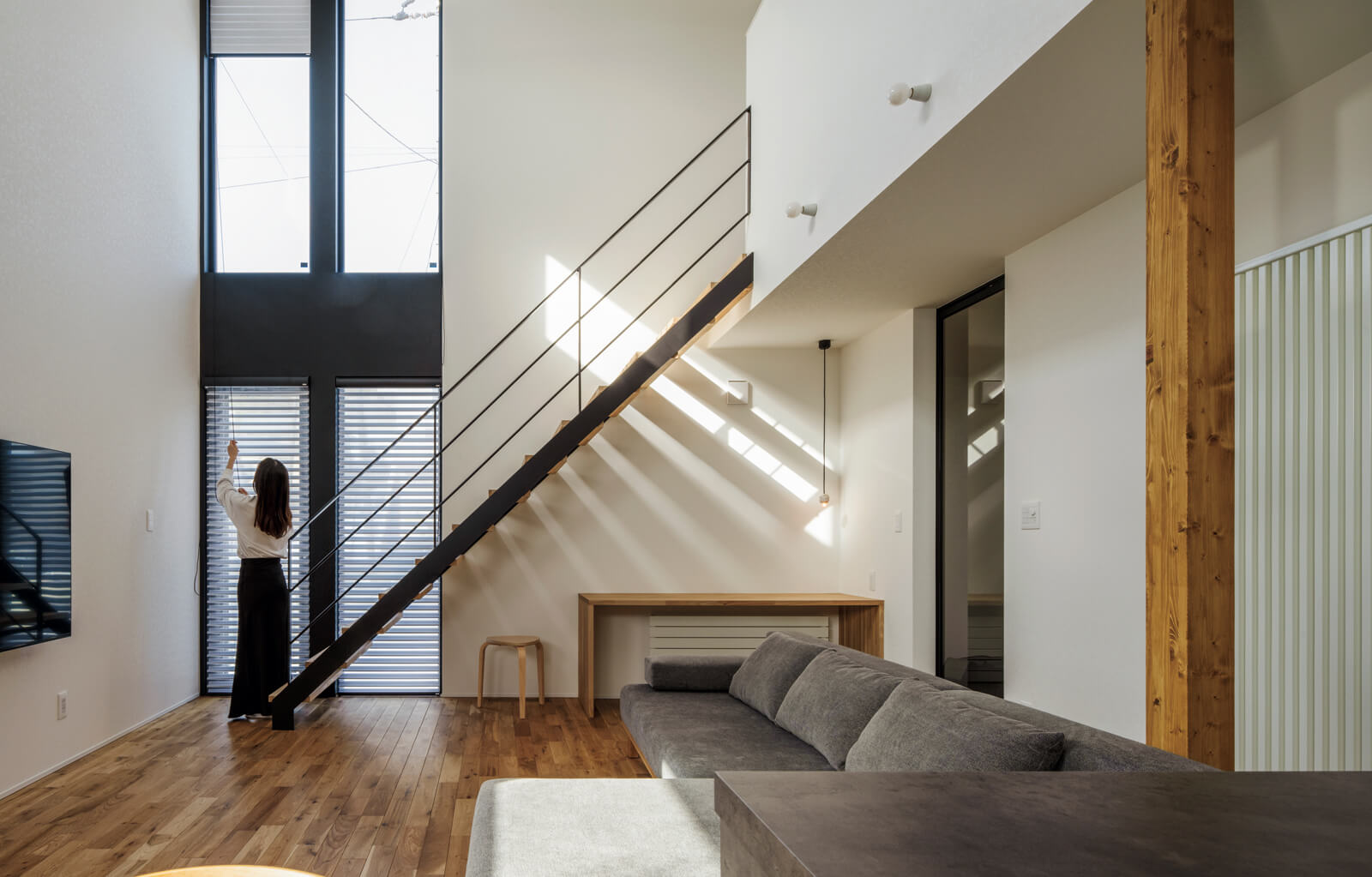 大きな吹き抜けリビングに鉄骨階段が美しく映えるデザイン住宅