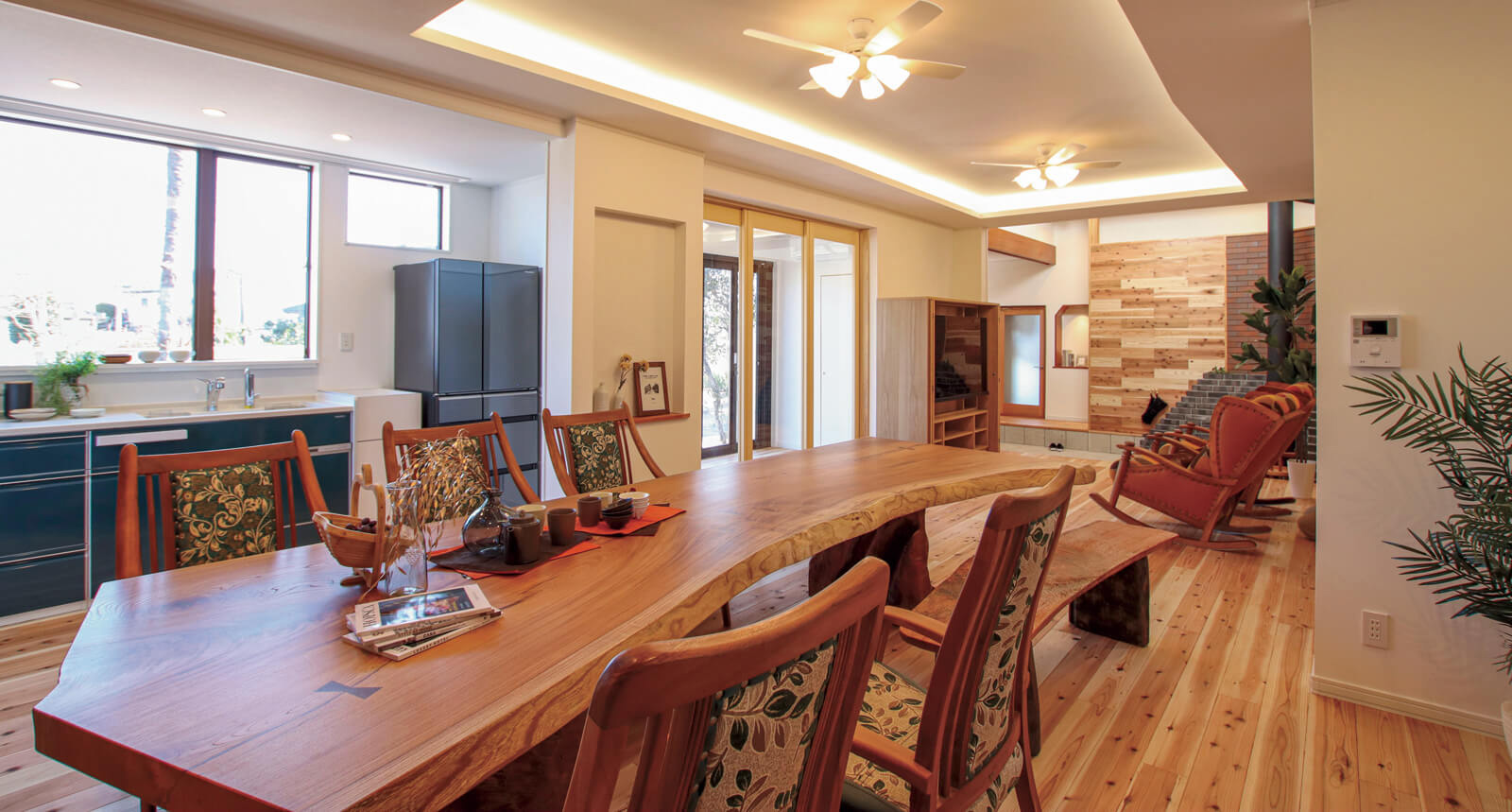 コンセプトは「つながりを感じる家」。構想を進め始めた矢先、ご夫妻は木工家具を手がける工房で、長さ4mほどもあるケヤキの一枚板に出会います。「この板を、みんなが集える大きいテーブルにしたい」。この強いご要望から、具体的な計画はスタートしました。