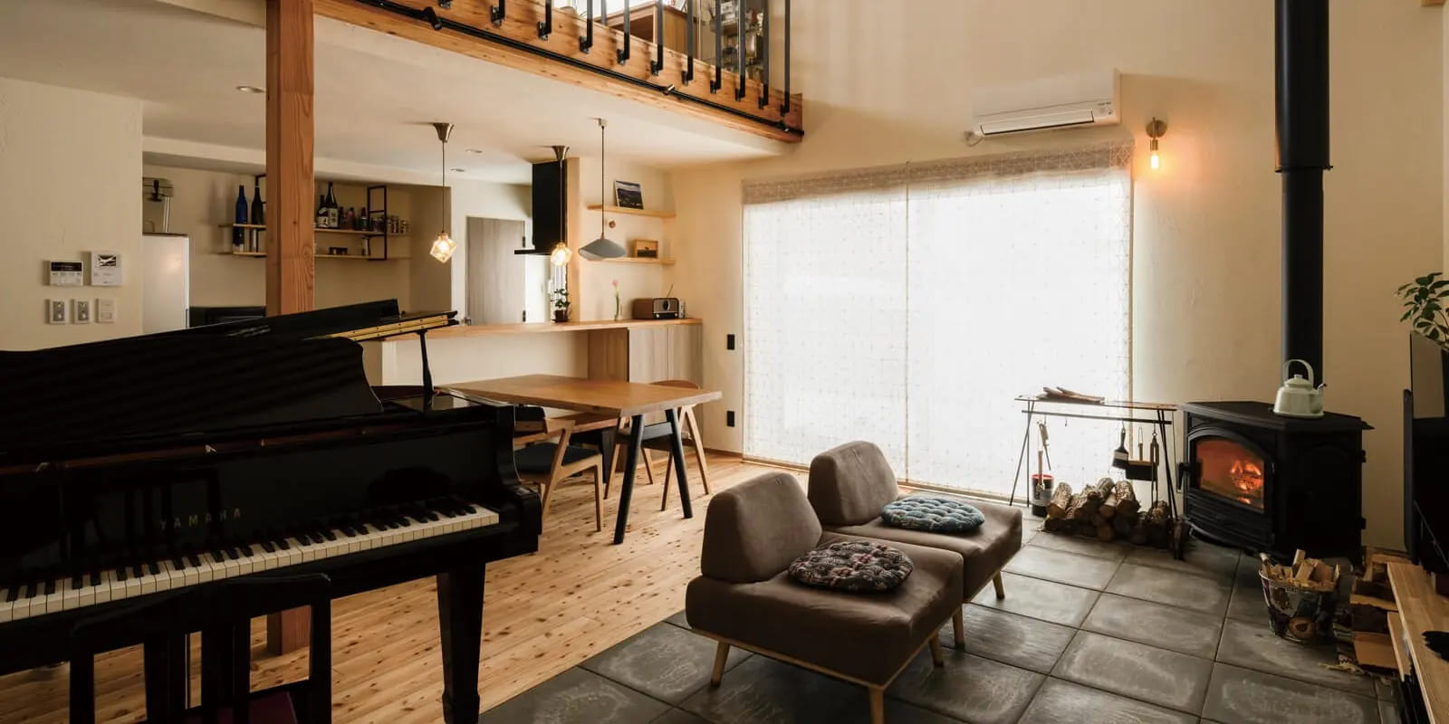 駅が近い住宅街の一角で理想の土地を見つけたSさんご夫妻。新たな住まいに希望したのは、「グランドピアノを置く」「大きな吹き抜けを設ける」「主暖房には薪ストーブを採用する」の3つです。「薪ストーブはもともと憧れがあったけれど、本格的に導入を決めたのは芦野組のオープンハウスに足を運んでから。炎のある暮らしの心地よさを実感し、気づけば導入は必須になっていました」と、当時を振り返ります。