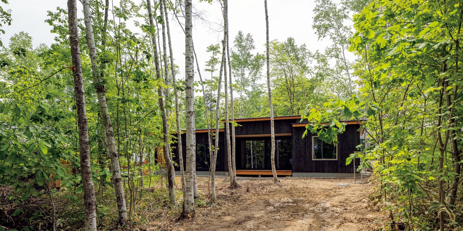 そして、雑木林が新緑に染まる頃、Yさんが夢に描いていた「北海道の家」が完成しました。市街地から離れた丘陵地に広がるのどかな分譲地に立つ住まいは、雑木林に溶け込むような佇まい。内外装にナラ、カバ、ニレ、エゾマツなど道産材をふんだんに用い、ドイツ漆喰で壁を仕上げた平屋は、開放感に満ちたリビングを中心にした2LDK仕様。リビングにはワイドスパンのスライディングサッシを採用したことで、Yさんの希望どおり、木々の葉音や緑の空気が室内にいても感じられる住まいに仕上がりました。