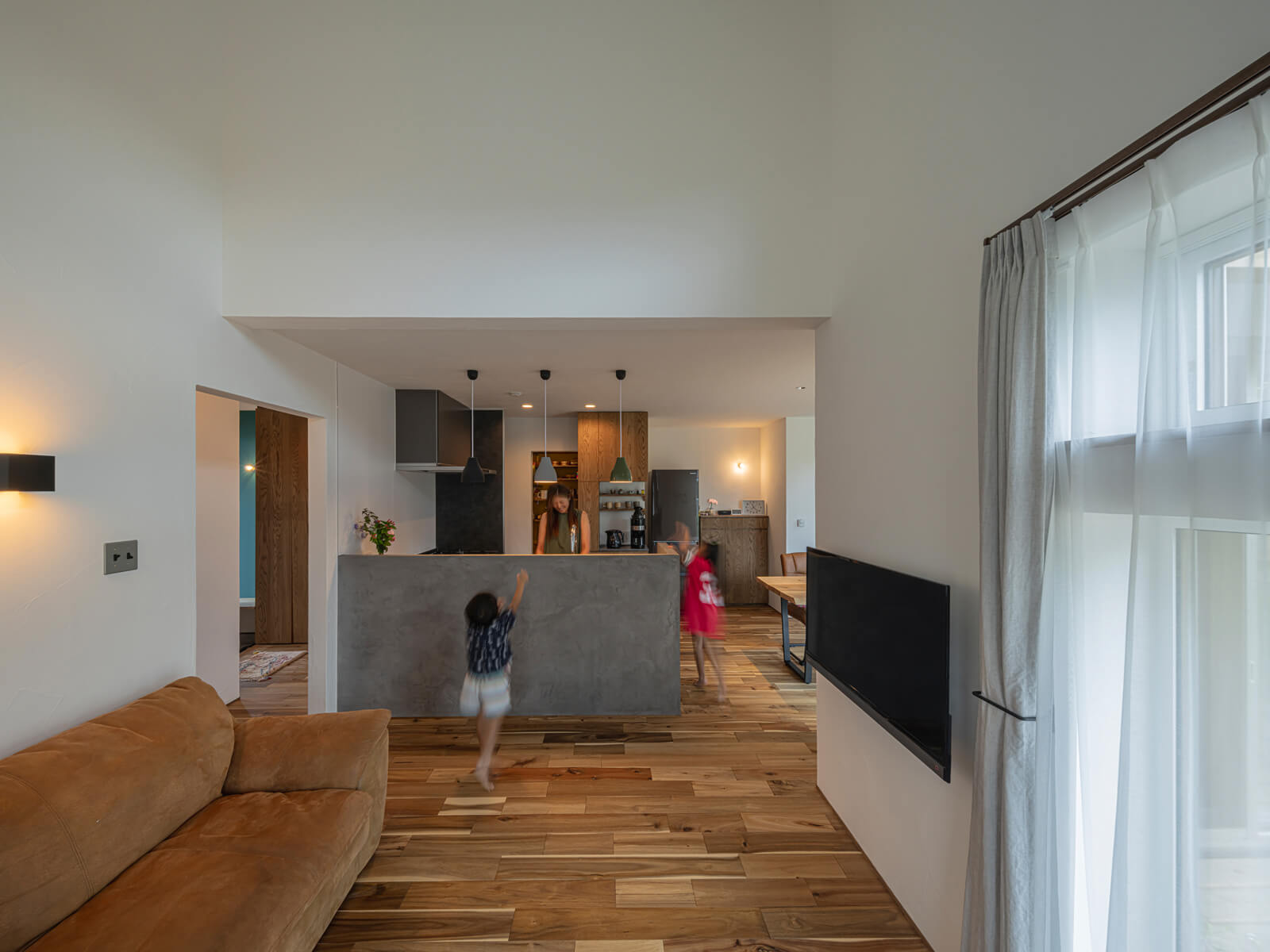 2025年3月、異動とともに新生活がスタート。周囲の緑を取り込む大開口や勾配の高天井、スキップフロアを採用したことで、延床面積以上の心地よい広がりが感じられます。料理好きな奥さんがこだわったキッチンは、玄関ホールから裏動線でつながるパントリーも併設。「家事をしながら窓越しに緑、リビングやフリースペースで遊ぶ子どもの姿も見えて、理想以上の仕上がりです」と微笑みます。