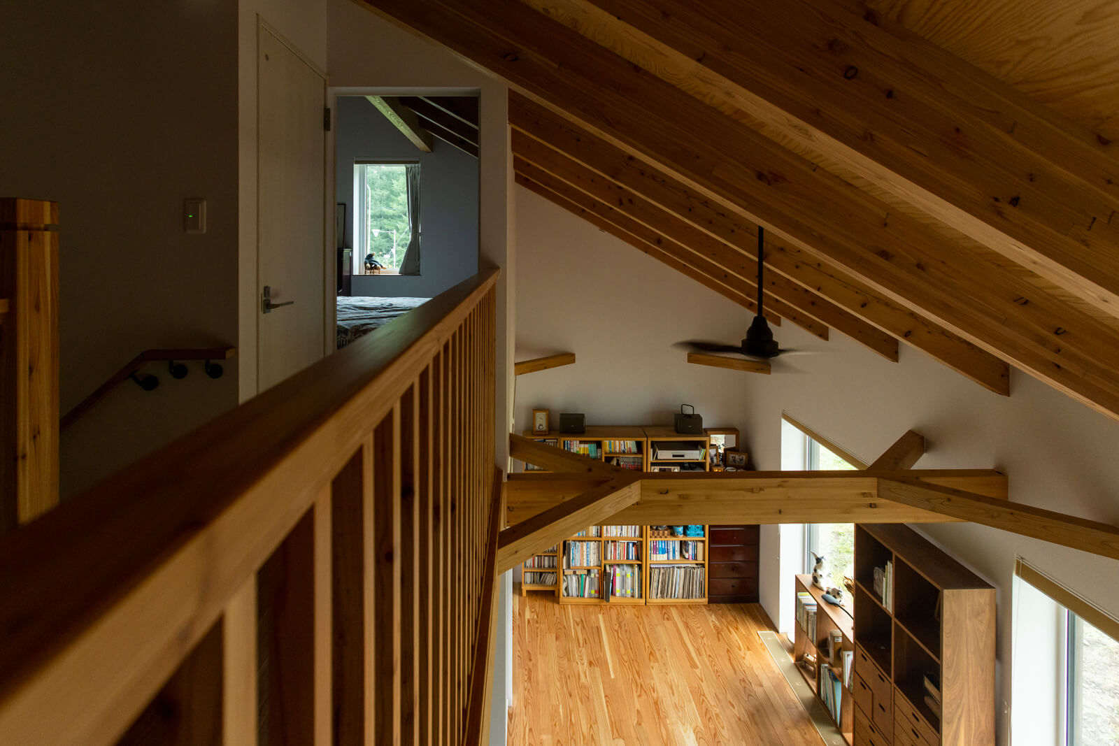 約26坪の住まいは、1階に建具や間仕切りを最小限にした開放感のあるLDKと水まわり、吹き抜けでつながる2階には寝室と書斎をレイアウト。移住後は、1階で奥さんが趣味の手仕事を楽しみ、2階の書斎ではEさんが45年の研究生活の総括となる論文制作に取り組んでいます。