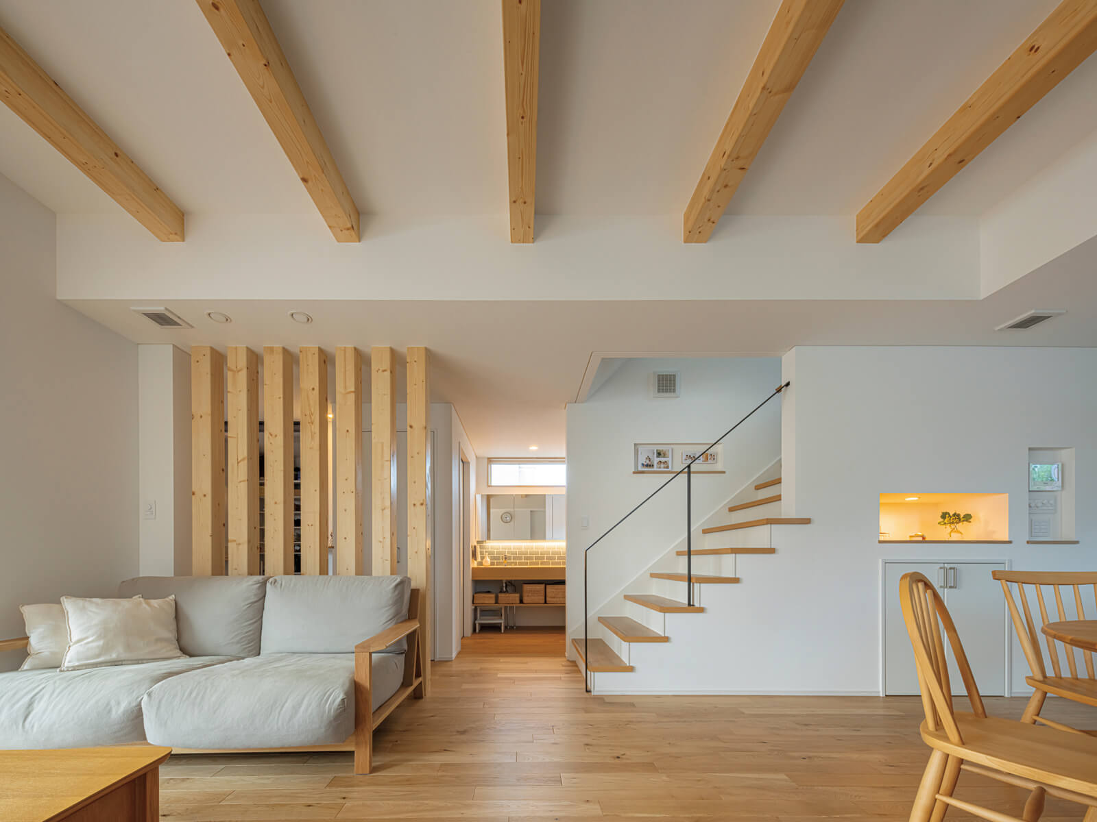 2025年3月に完成したHさん宅は、木の温もりを生かしながら、3人の育ち盛りのお子さんたちとご夫妻がのびのびと暮らせる住まいを目指してつくられました。全館空調システムを採用し、自由度の高い空間づくりを実現。細かな打ち合わせを重ね、現場でもHさんが施工担当の職人とじっくりと話し合いながら完成させた住まいは、歳月とともに愛着を深めていくことでしょう。