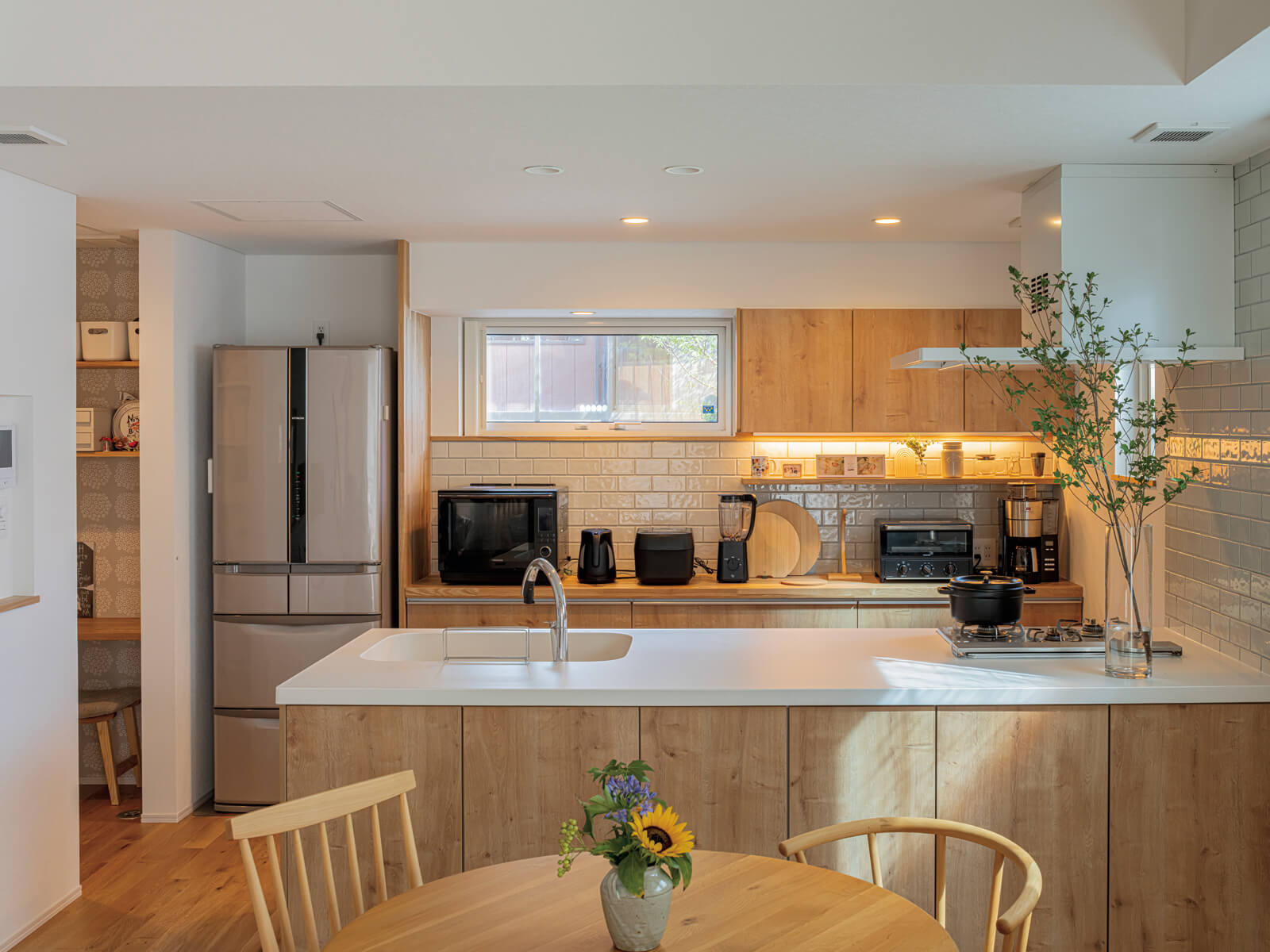 奥さんが「長年の夢だった」という、ゆったりとした対面式キッチンも新築で実現。LIXIL製システムキッチンをベースに、背面カウンターやリビング側にも容量たっぷりの収納を設えた。さらにキッチンに隣接して奥さん専用の造作デスクを備えたパントリーを配置。料理やデスク作業をしていても、リビングや庭先で遊ぶ子どもの様子も見ることができる。「隠せる収納にもこだわりました。きめ細かな収納計画のおかげで、忙しくてもキッチンまわりを手間なくきれいな状態に保てるので助かっています」(奥さん) |