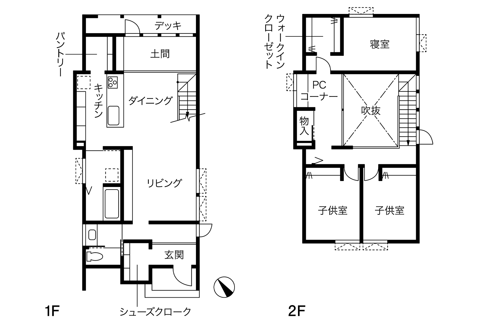 高さ5mのダイナミックな吹き抜けを設けたダイニングにはアイアンのスケルトン階段が設えられ、見上げると2階にレイアウトされた子ども部屋や家族共用のPCコーナーも見渡せます。家族がどこにいても互いの気配を感じることができるダイニングは、まさに「暮らしの中心」にふさわしい佇まいです。