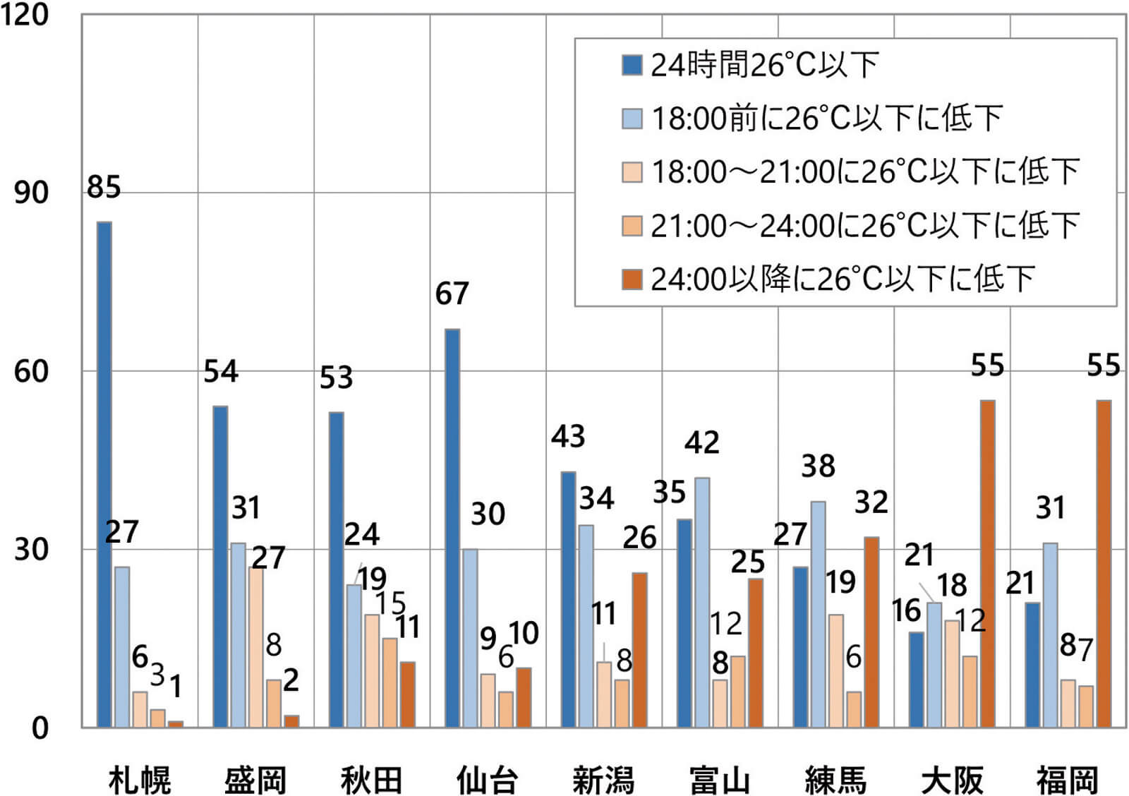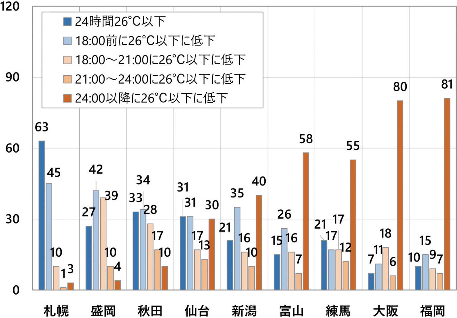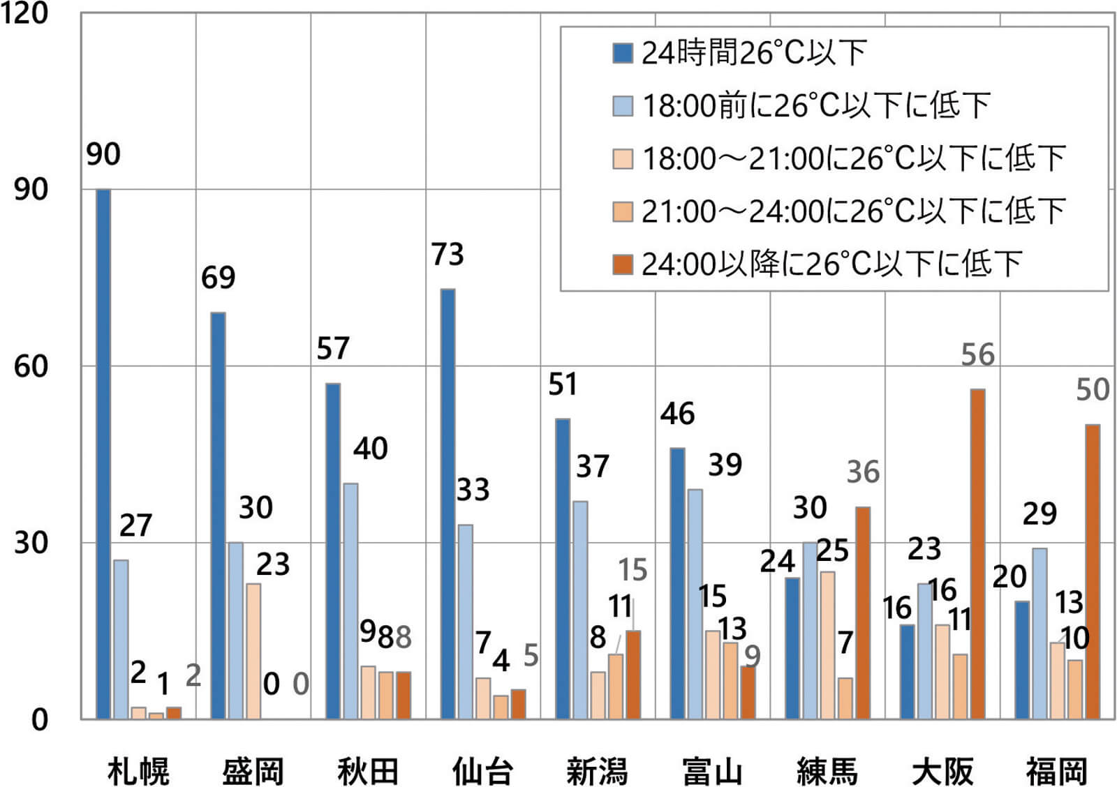 いずれにしても、東京から西日本にかけての都市と比べると、桁違いに少ないことが分かります。しかし、このような日が1日でもあればとても暑くて寝苦しくなりますから、エアコンが必須であることは間違いありません。