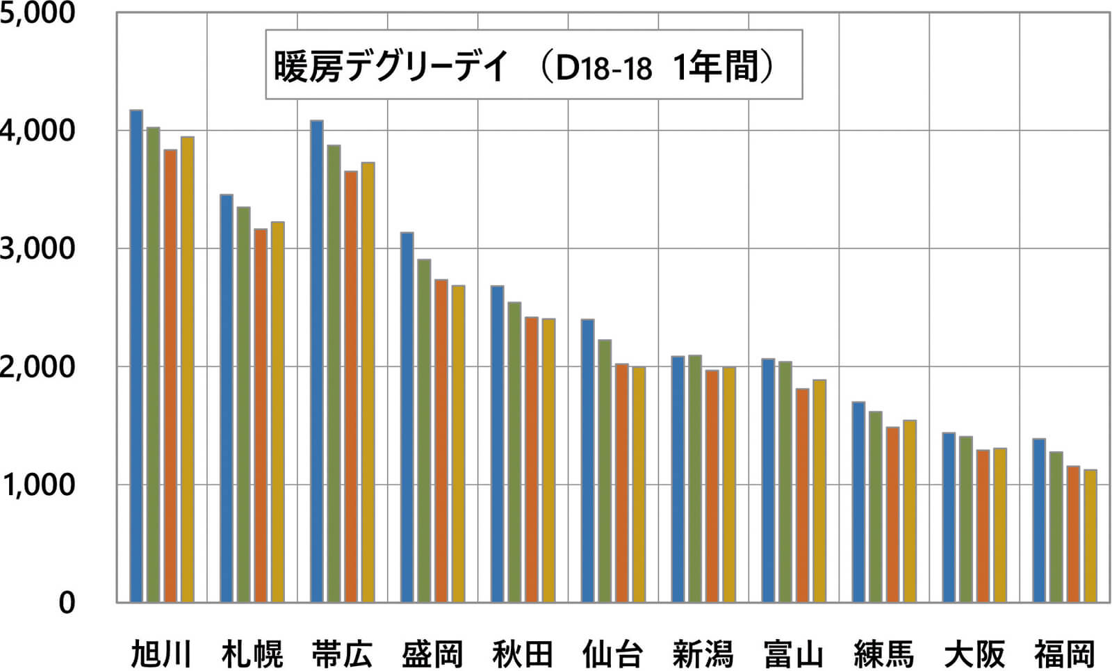 冬は毎日のように平均外気温が18℃より低く、北海道では3,500~4,000くらいの値になり、夏は、逆に平均外気温が27℃を超えた分を加算します。北海道はほとんどゼロに近い値ですが、本州ではかなり大きな数値になります。これをもとに暖冷房負荷を計算するのですが、当然この値が大きければ寒さ、暑さの程度が強いことになります。