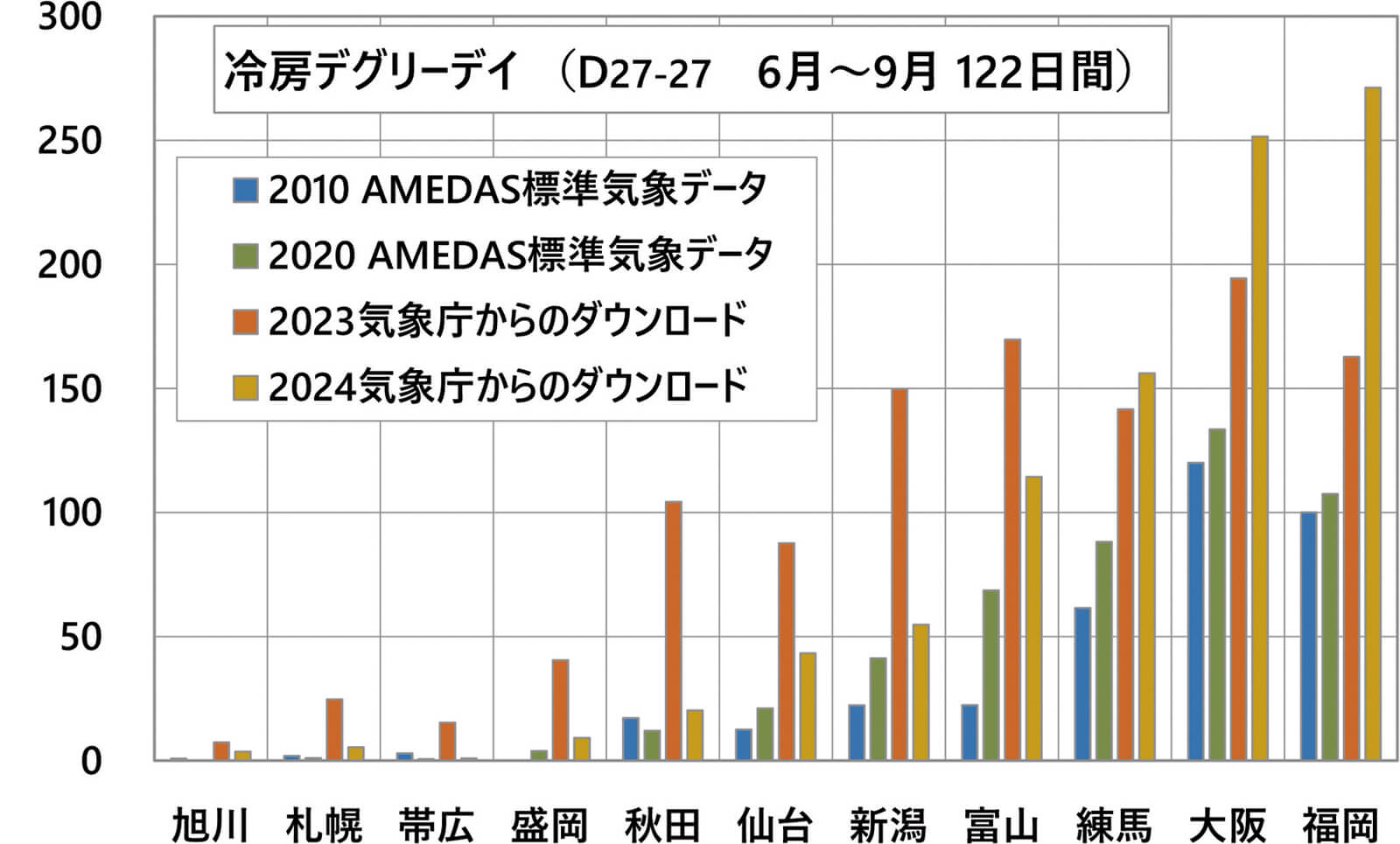 図1は暖房デグリーデイDD18-18と冷房デグリーデイDD27-27について、2010年版と2020年版のアメダス標準気象データと、2023年および2024年の気象データから計算したものです。デグリーデイとは、室温(この場合は18℃と27℃)と毎日の日平均外気温との差を1年間積算したものです。