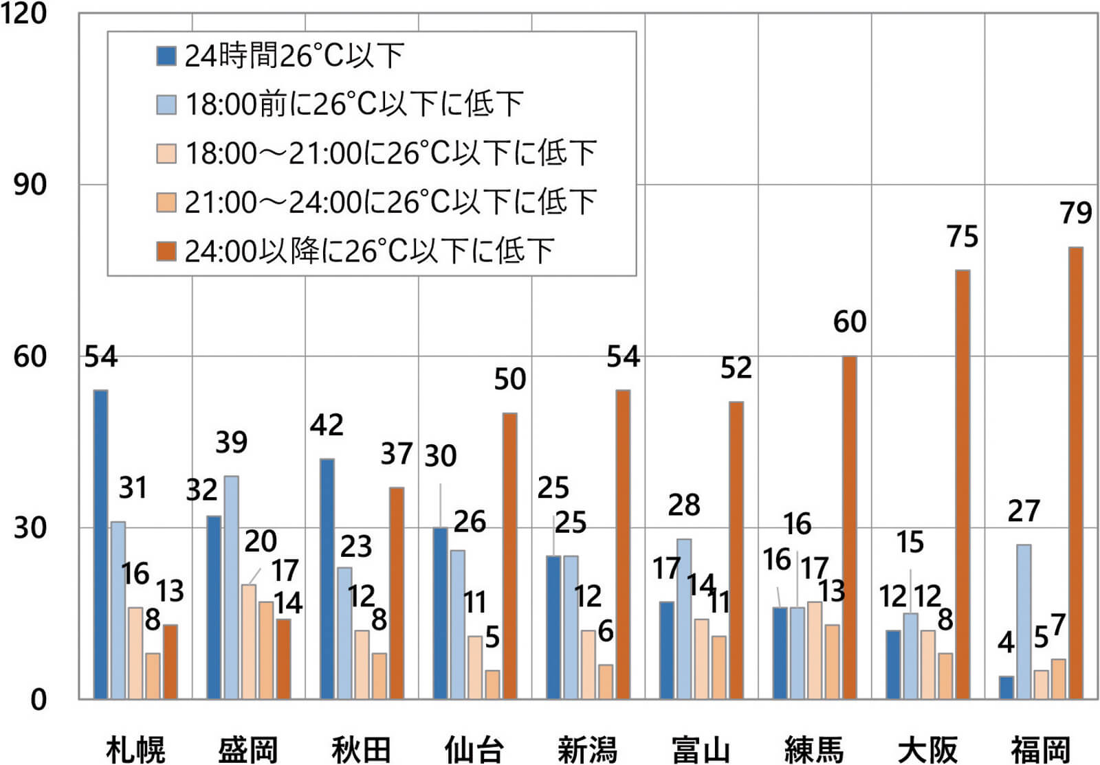 私が全国の工務店のセミナーでいろいろ聞いてみると、関西では28~30℃、東北は26~28℃くらいになるようです。北海道はどうでしょうか。家の中にはいろいろ熱の発生源があり、日射も入ってきますから、窓を開けて通風しても室内の温度は1~2℃高くなってしまいます。そこで、この温度を26℃に設定して、日中の最高温度から次第に下がって外気温が26℃以下に下がる時間を毎日記録し、時間帯別に集計してみました。