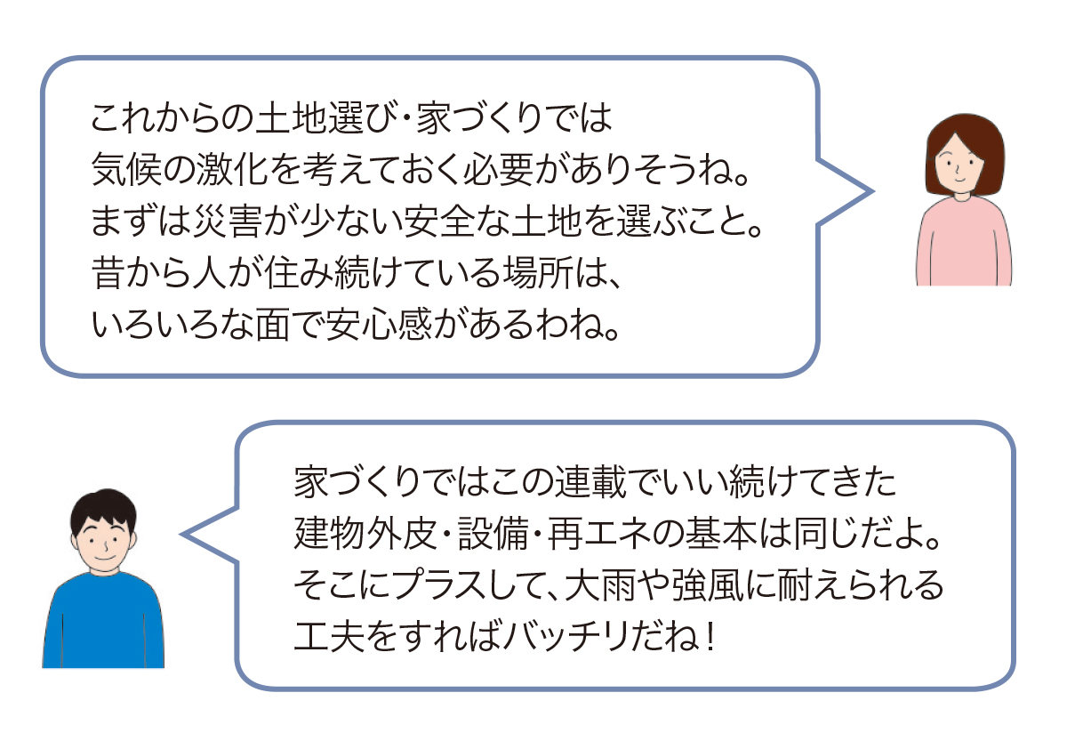 今回は、夏の猛暑化と自然災害の激化に備えた家づくりについて考えてみました。冷房と太陽光発電といった家単位での必須項目はもちろん重要ですが、結露や雨じまいへの配慮、そしてなにより洪水や高潮などの災害に備えた土地選びが重要です。よく調べて先を見通して考えて、自分自身の暮らしや先々も守れる家づくりを実現してくださいね。