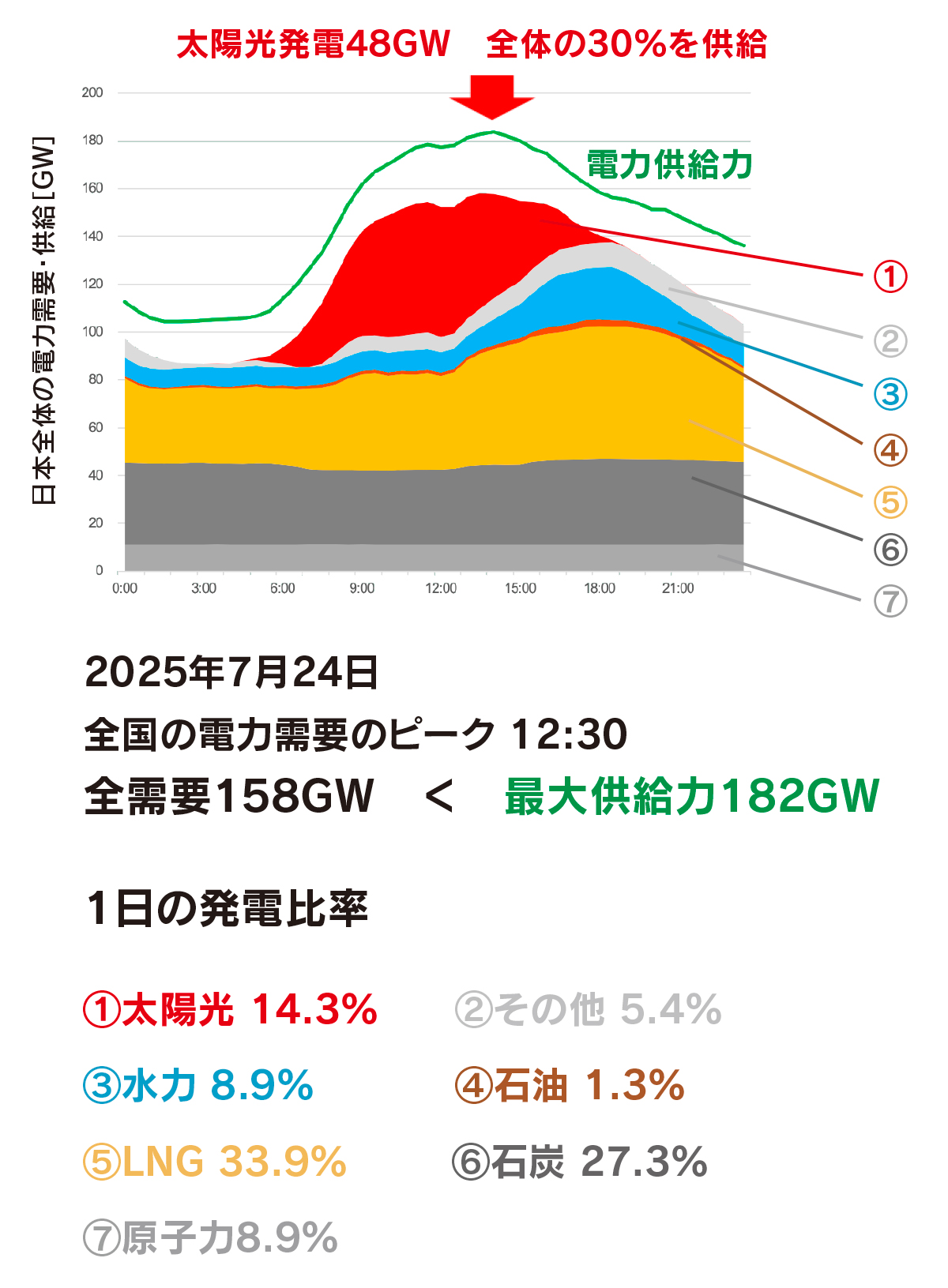 冷房使用により昼間に電力需要は大きなピークを迎えていますが、増加分の大半は太陽光発電で賄えていることが分かります。