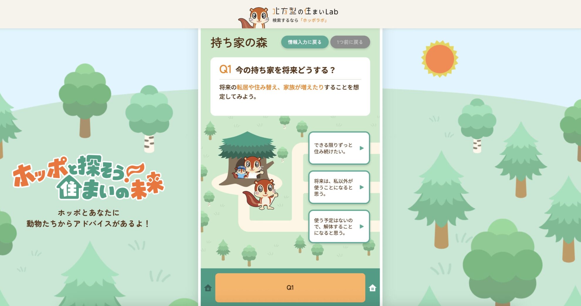 その北方型住宅なんだけど、公式WEBサイトで「ホッポと探そう!住まいの未来」という改修診断WEBツールを公開しているんだ。今の住まいの環境や考えている未来像に合わせて答えて選んでいくと、リフォームや建て替え、売却・貸出など、さまざまな中から適している選択肢のアドバイスと、あらかじめ知っておいたほうがいい情報サイトを紹介してくれるの。とても簡単だからみんなも一度やってみてね!