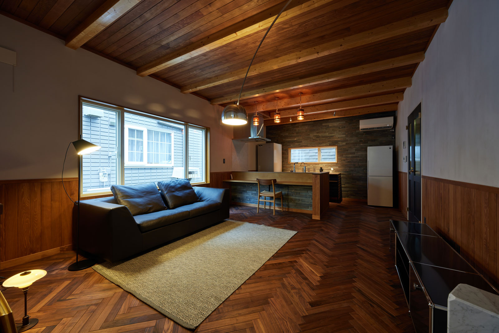 リノベーションにあたり、内装のイメージをしっかり決めていたMさん。念願のヘリンボーンの床には、ブラックウォールナットの無垢材を使いました。キッチンの壁とカウンターの腰壁にも同じ材を使ったデザイナーズウォールを贅沢に配しています。淡くグレーがかったホワイトがクールな印象を与える土佐漆喰の塗り壁や、青森県産のヒバ材を取り入れた天井や90㎝の腰板など、室内は自然素材の温もりに包まれた心地よい雰囲気です。
