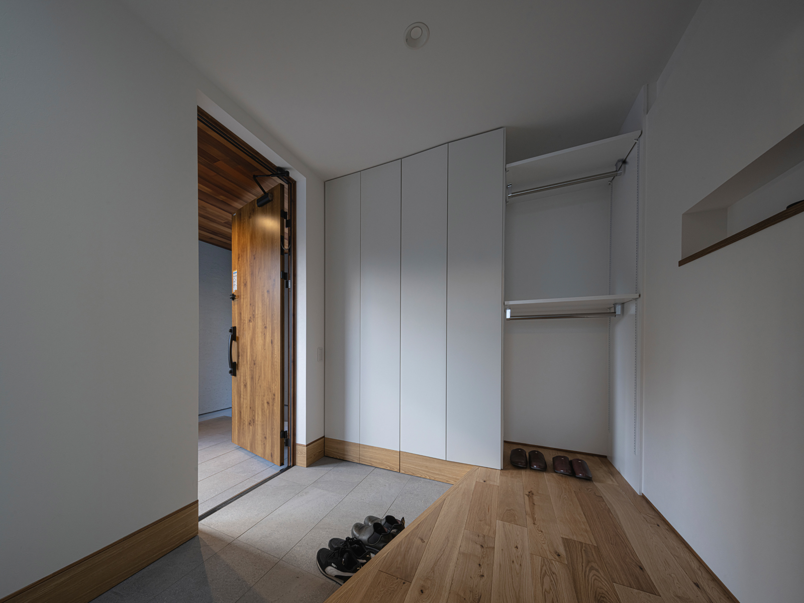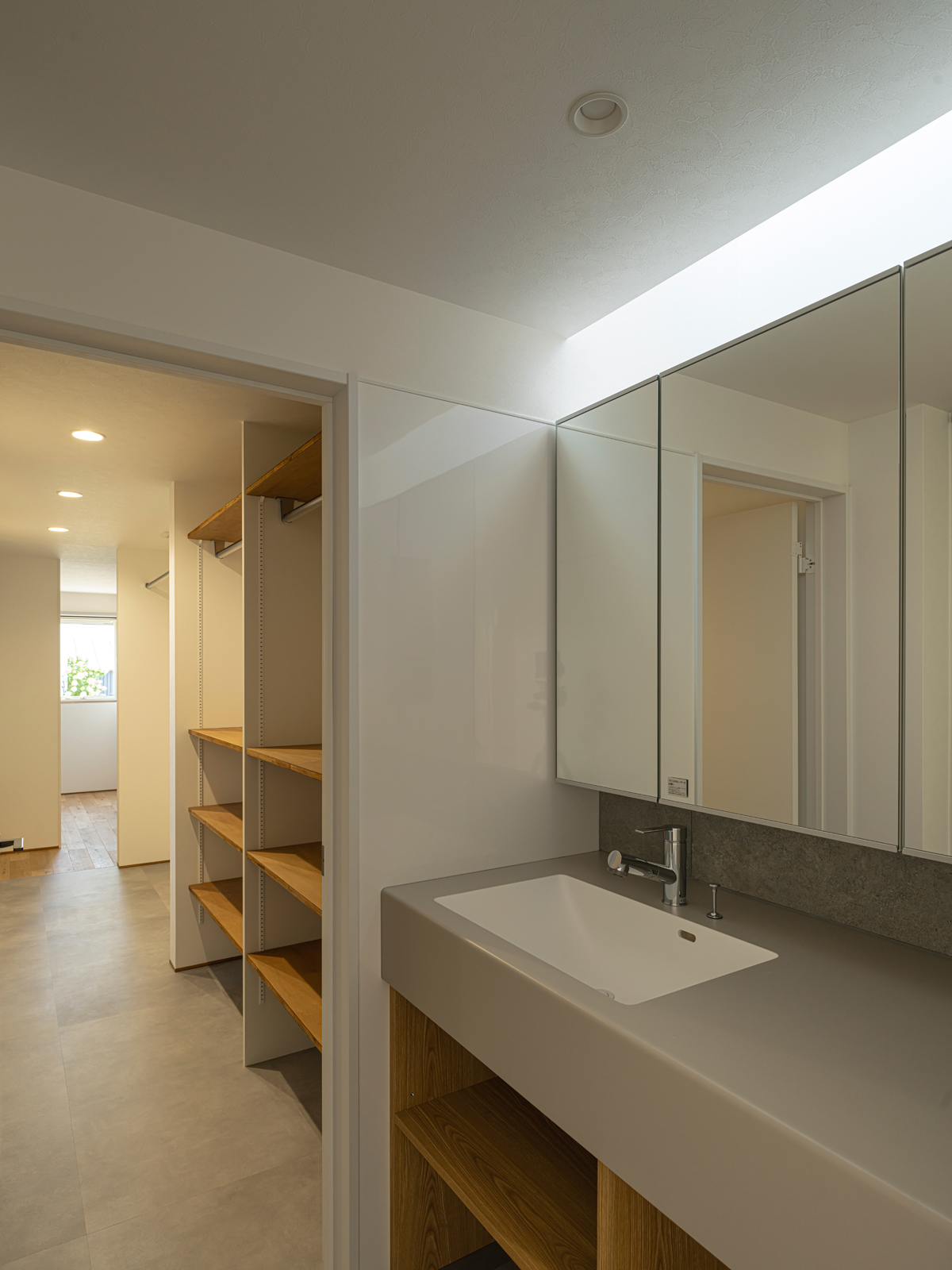 キッチン部分の通路と、奥の水まわりの通路は二重で回遊できるようになっていて、共働きで日々忙しいYさんご夫妻にとっては効率よく家事を分担できる優れた間取りです。また水まわりの廊下はファミリークローゼットも兼用し、家事動線や使い勝手がよく空間を無駄なく活用しています。