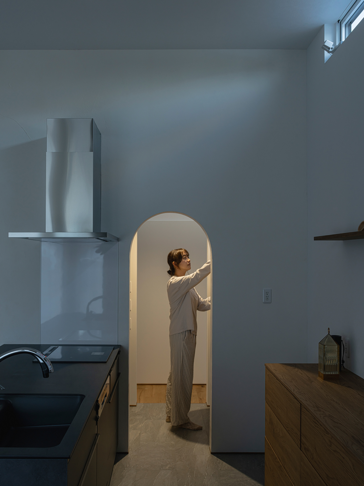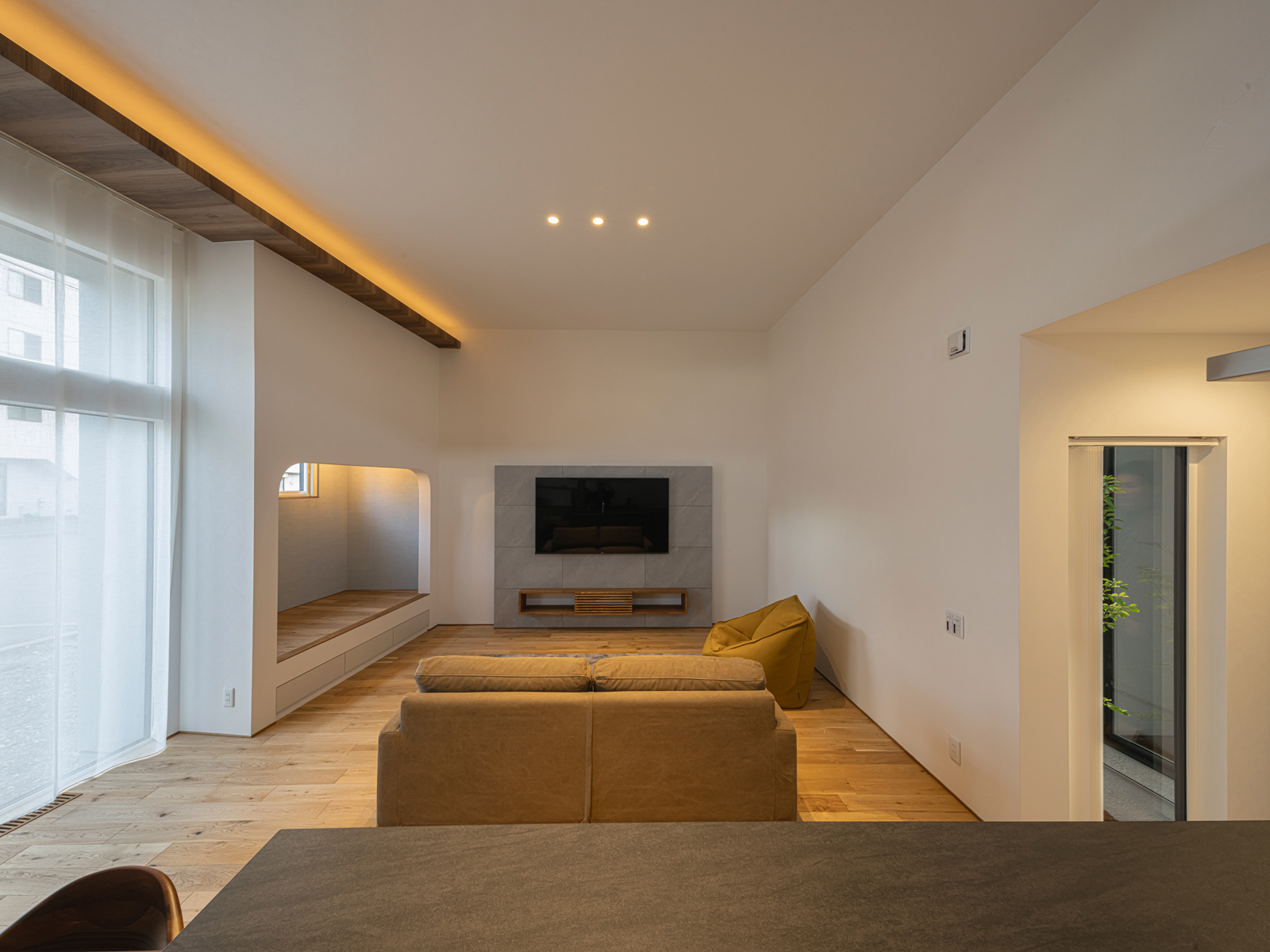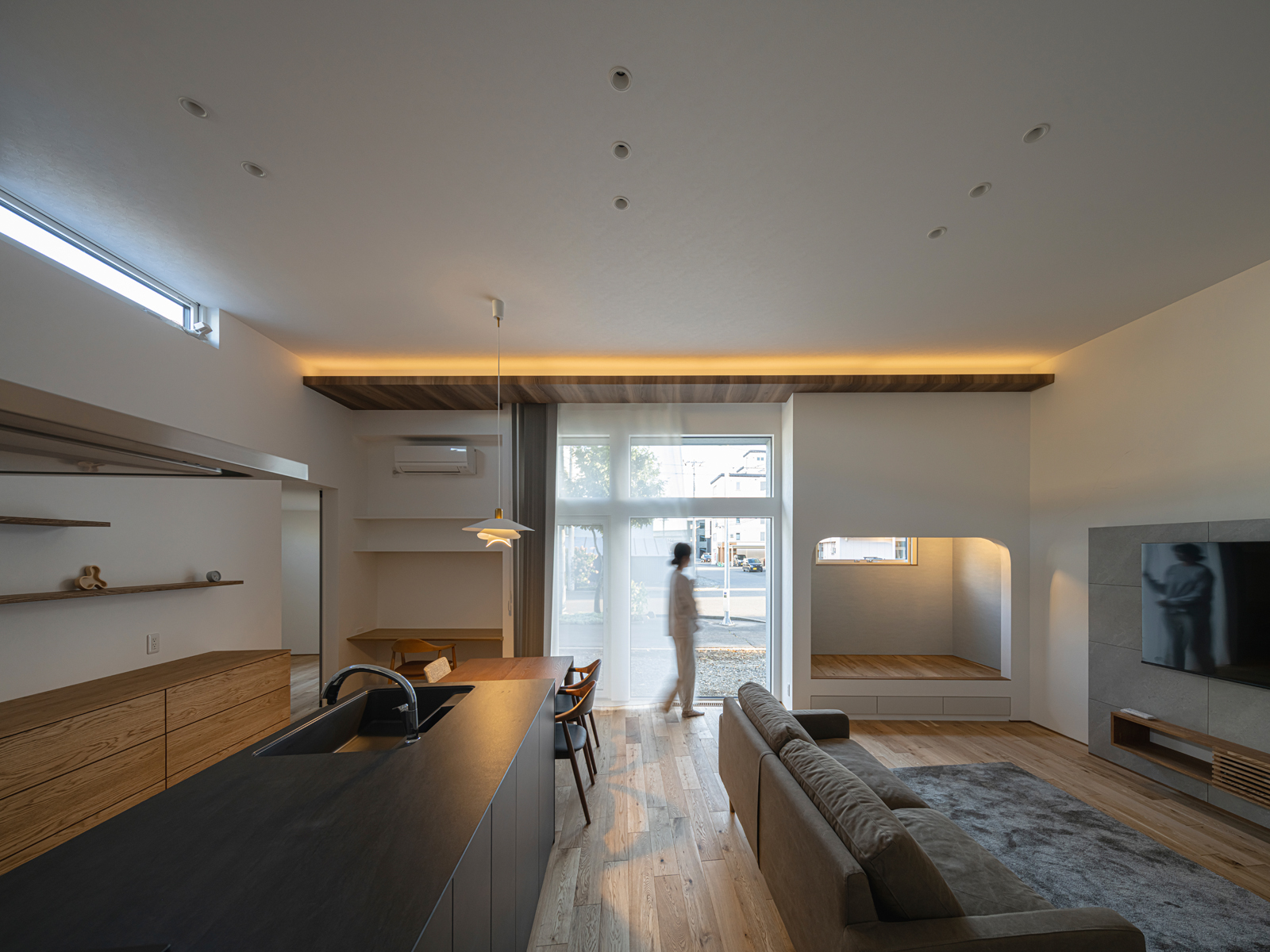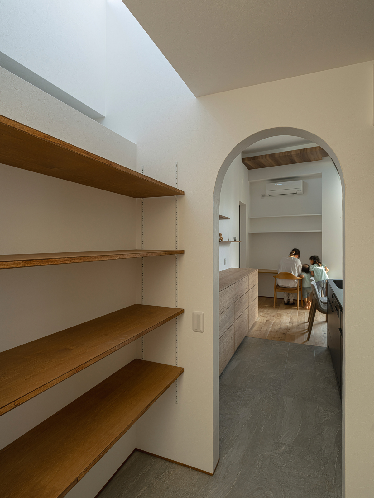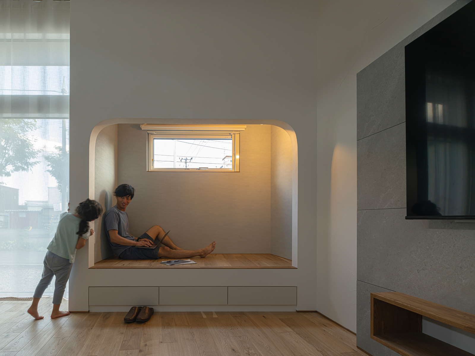 効率や機能性を重視する一方で、デザイン性や遊び心も忘れないのが吉田さんの設計。「かわいいスペースがほしい」という願いに応えてつくられたのがリビングのヌックです。アールの仕切りや青空と雲をイメージしたインテリアは、たちまち2人の娘さんの心を掴みお気に入りの場所に。Yさんの小さな書斎は隠れ家のような雰囲気。子ども部屋は扉を開ければ1部屋になる仕様です。平屋の難点ともいえる収納の確保も、壁と一体化するフラットな扉や通路兼用パントリーなど、利便性とデザイン性を見事に両立させています。