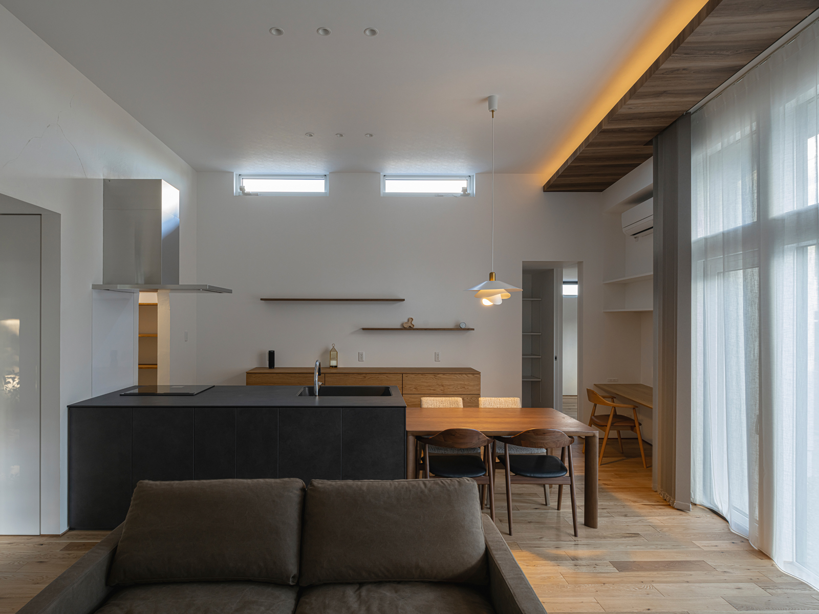 家の主役は天井高3.3mの開放的なLDKです。できるだけ仕切りをつくりたくないという希望に沿って、キッチンはオープンに。最もこだわったキッチン天板は高級感あふれるブラックのセラミック。面材はブラックでそろえて「絵になるキッチン」に仕上げています。壁面の収納も吊り戸棚は設けずシンプルな飾り棚スタイルで、キッチンと高さをそろえた大容量のカウンター収納を造作しました。