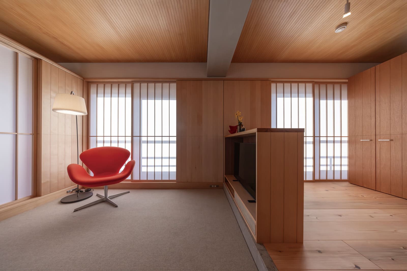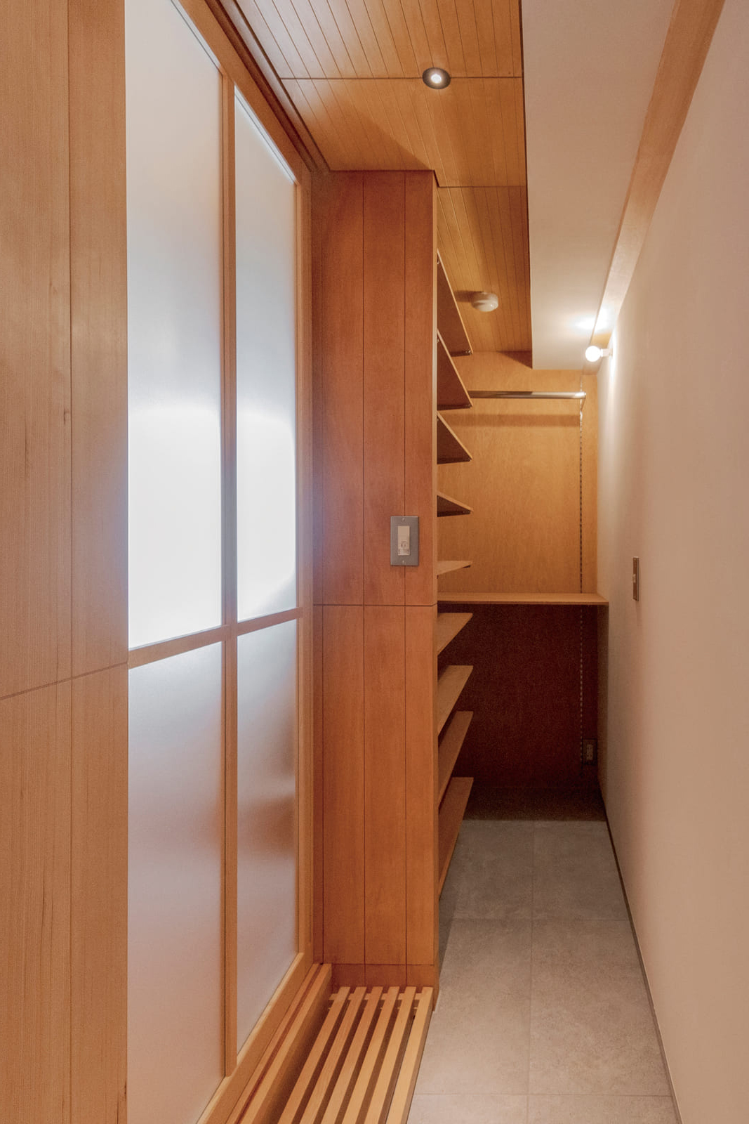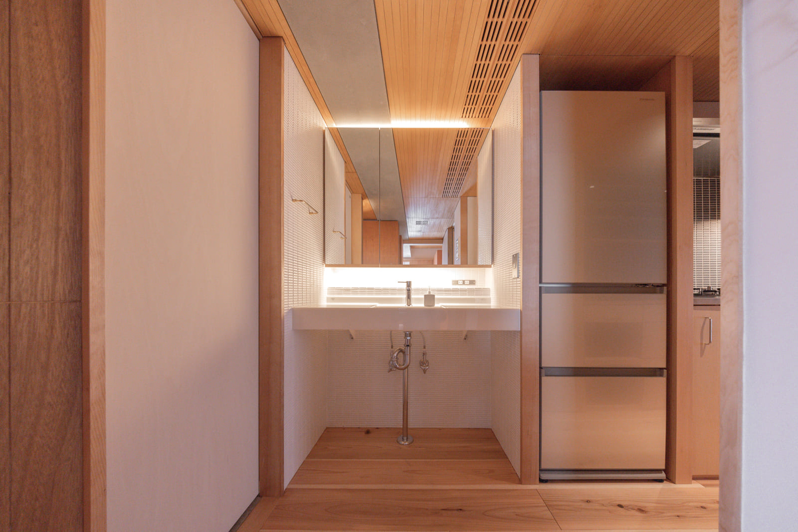 扉を開けると、画一的なマンションとはひと味もふた味も異なる内装空間に驚かされることでしょう。床には奈良県吉野産のスギ、壁にはラワン、天井にはシナを使用。この木の温もり豊かな室内に、白河石、漆喰、和紙などの異素材が調和し、唯一無二のくつろぎ感を醸し出しています。設計全般を担当したのは、「木のマンションリノベーション」を早くから提唱し、全国で設計活動を展開する建築家の小谷和也さん。素材使いはもちろん、精度の高い採寸から生み出される美しい納まりなどにも小谷さんらしさがあふれています。