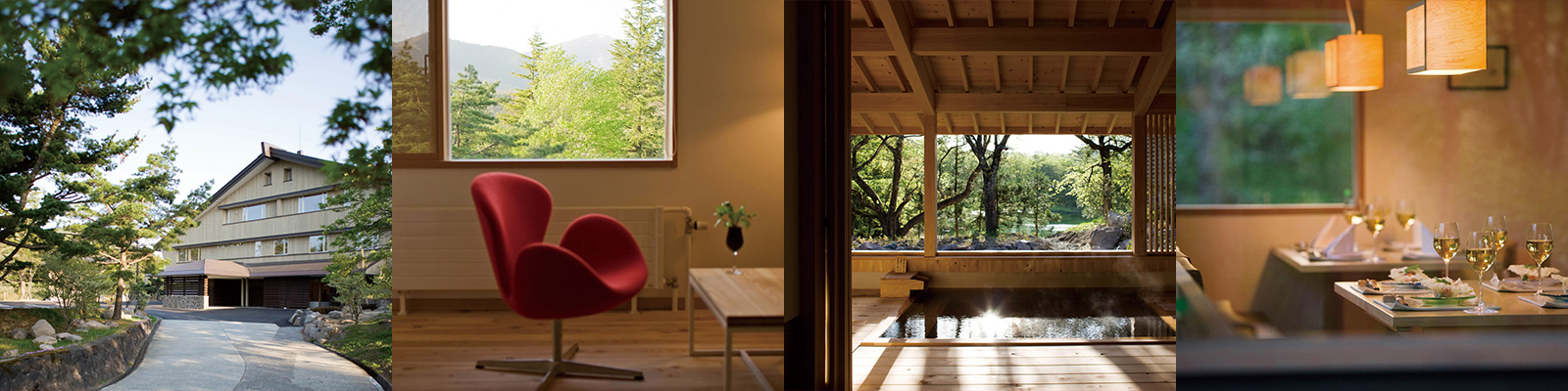 磐梯朝日国立公園の中に立つ「ホテリ・アアルト」は、築40年の山荘をリノベーションしたリゾートホテル。建築家の益子義弘さんが設計を手がけています。もともとの地形や建物の骨格をできるだけ生かし、地元の木をふんだんに用いて構成された空間は、北欧と和のテイストが調和し、心地よさも格別。個性的な17室の客室のすべてに住宅で使うようなデザイナーズ家具や照明がさりげなく設えられ、「暮らすように泊まる」を体感できます。