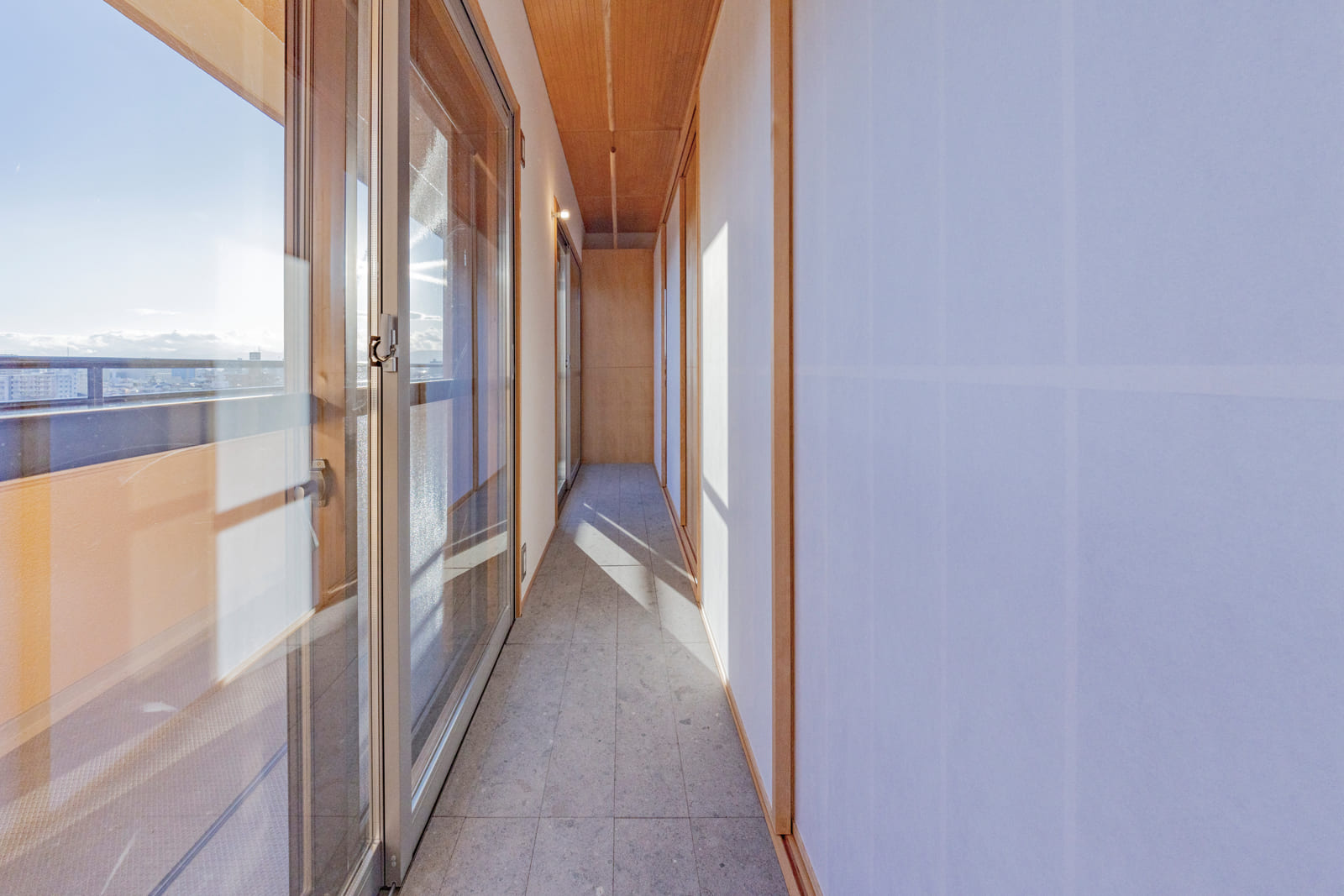 SIMOKUがリノベーションし、モデルルームとして公開しているのは、築30数年になるマンションの高層階の角部屋。郡山市街や遠く会津の山並みを一望できるその部屋は、フィンランド語で“光の空間”を意味する「ValoTila(ヴァロティラ)」と名付けられたとおり、2方向から入る陽光が心地よい空間です。郡山の住宅業界ではここ数年、中古マンションの買取再販の動きが加速。そんな中、「マンションでも木に囲まれて暮らしたい」というSIMOKUユーザーの要望を受け、このモデルルームが誕生しました。