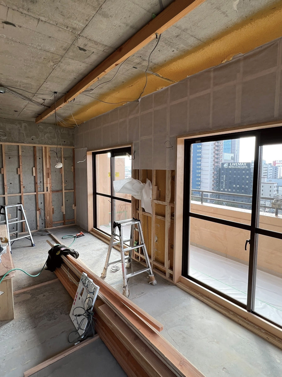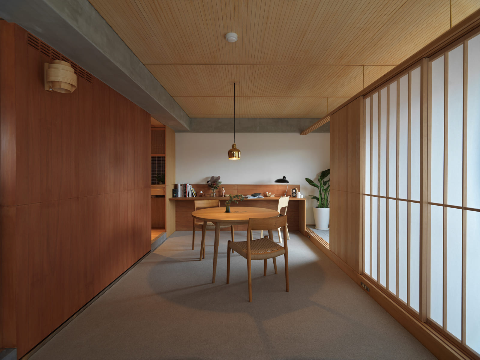 SIMOKUのマンションリノベーションは、結露にも大きく関わる断熱性能不足という課題を解消することが大前提です。というのも、それこそが本当に快適な暮らしの鍵を握るものであると考えているからに他なりません。「ValoTila」においても、外部に接する内壁に断熱材を施工し直し、すべての窓に内窓と障子、板戸を設置。また、リビング・ダイニングには床の下地材の上に遮音ボードを置き、さらにその上にカーペットを敷き詰めました。こうして断熱性能を強化したこの住まいでは、エアコン1台で一年中心地よい暮らしが可能。光熱費も少なくて済みます。また、中古マンションのもう一つの課題として、外部への音漏れや外部からの騒音が挙げられますが、前述した断熱対策は遮音対策を兼ねているという点も見逃せません。