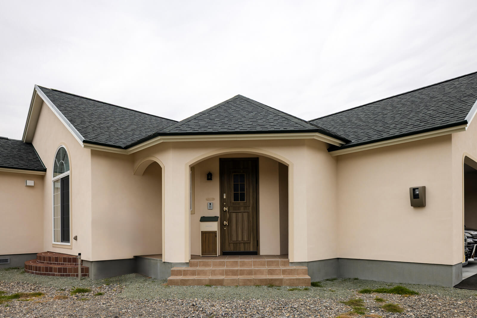 三角屋根と寄棟屋根を組み合わせた外観は、ファーストプランで朝日社長が提案してくれたデザインでした。現場で大工さんの仕事を目の当たりにして、それをカタチにしていくには高い技術が必要なことが分かりました。また、リビングから水まわりへ続く廊下の天井も、朝日社長の提案でアールをつけてクロス張りで仕上げられています。カントリーヴィレッジならではの上質でデザイン性豊かな住まいは、高い設計・施工力に支えられているのだな、実感しています。(奥さん談)