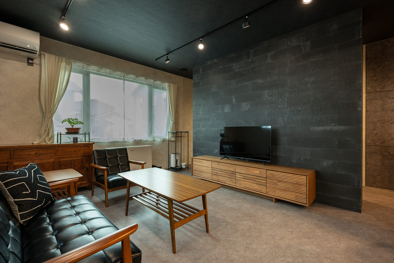 デザインや間取りに関しては、住まい手それぞれの理想を実現できるよう柔軟なスタイルです。木目は好みではないというTさんご夫妻が希望したのはインダストリアルなデザイン。壁や天井は石目調のクロス貼りとし、床も手入れが楽で長持ちする石目調のフロアタイルを全面に張るなど、スタイリッシュに仕上げました。