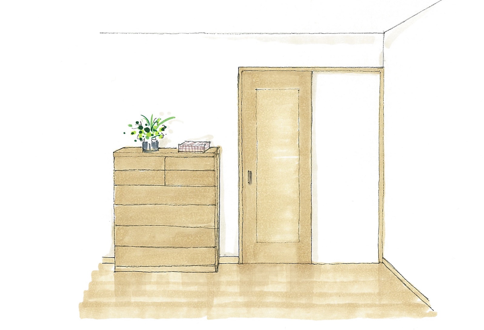 室内側はチェストやタンスなどの、押しても簡単には動かない家具を配置。廊下側は引き手側に縦手すりを設置し、身体を預けられるようにしました。引き戸自体は小さな力で開閉可能な軽めの戸を、引き手は大きめで手がかりがよい深めのものを選んで、使いやすさに配慮しています。