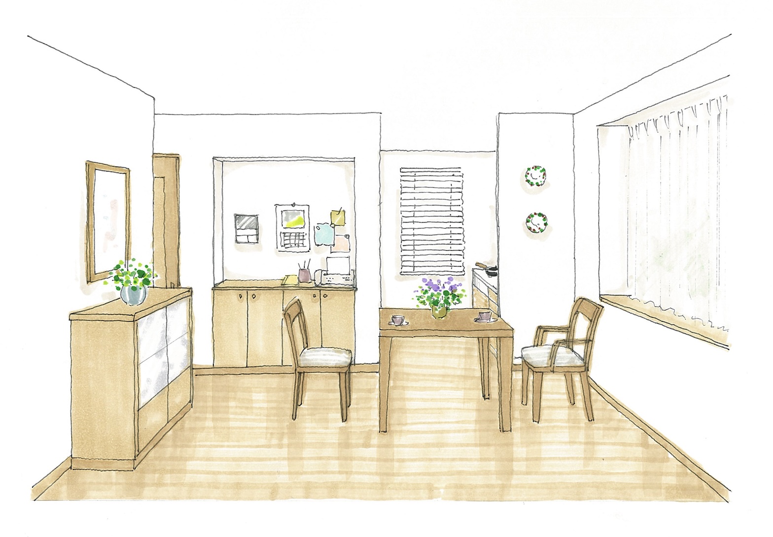 LDKは比較的家具が多い空間なので、「出窓のカウンター」→「椅子の背」→「テーブル」→「キッチンワークトップ」のような移動経路が容易にプランできました。