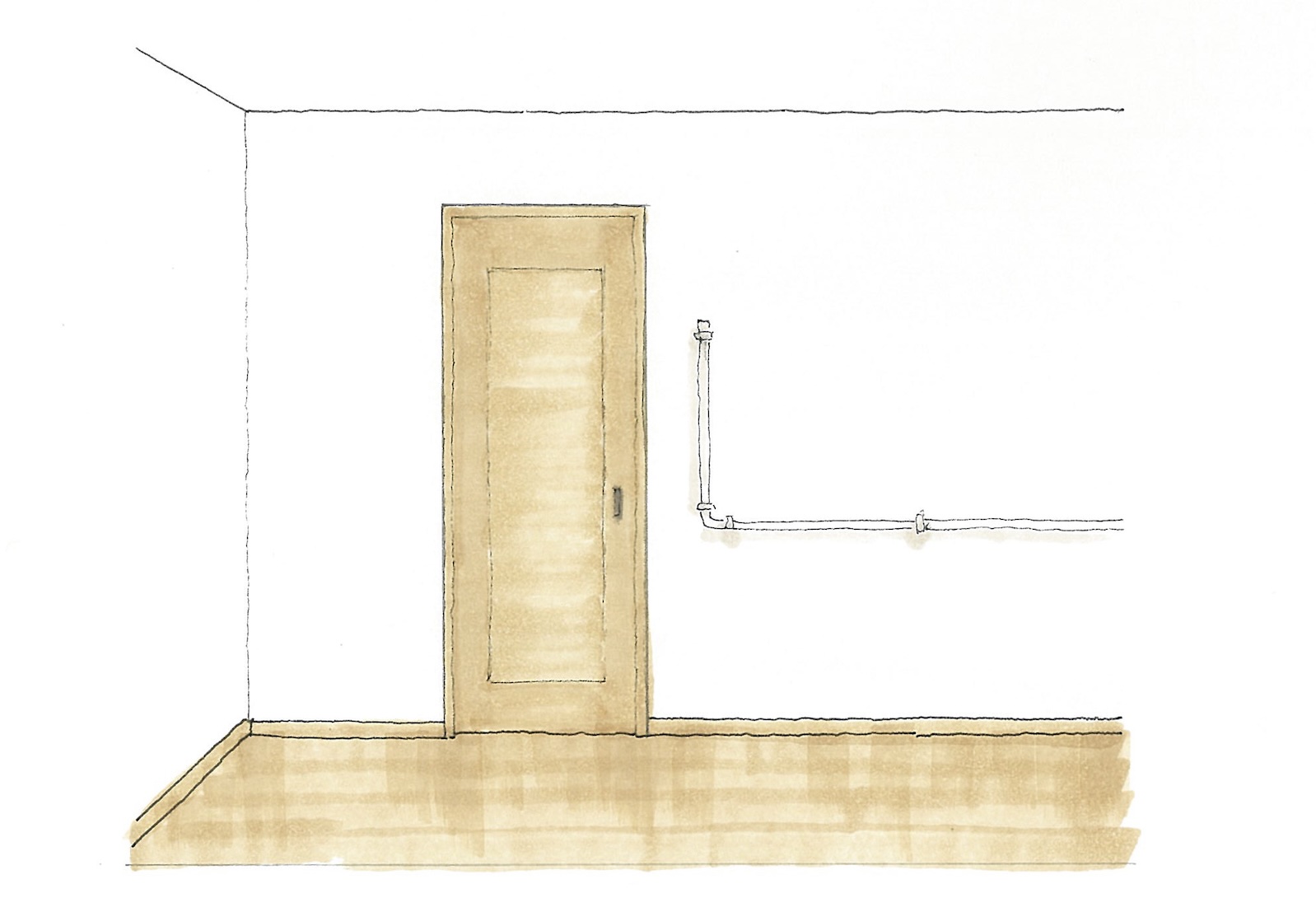 Aさんは、引き戸を開け閉めする際に身体が不安定になりがちでした。左足で体重を支えられないために左右・前後ともに体重移動が難しく、ふらつくと危険です。そこで、戸の開閉時に寄りかかれるスペースを確保し、利き手で戸を開けやすくしました。