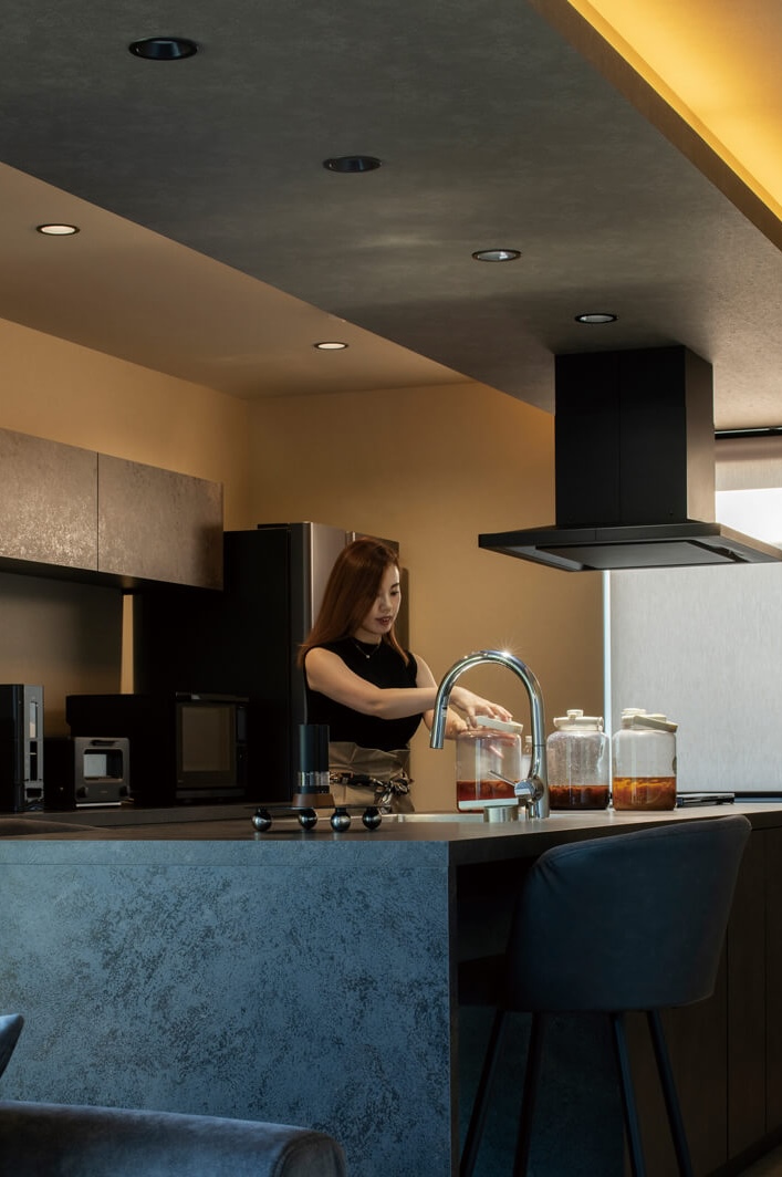 黒とグレーを基調とした室内は大人の雰囲気漂うホテルライクな空間。複数の間接照明やテレビボード背面に張った石調のエコカラットなども、上品さをプラスします。広いリビングは、光が射し込む縦長の4連窓と勾配天井が開放感を生み出し、奥さんこだわりのグラフテクトのアイランドキッチンは、下がり天井と組み合わせることで落ち着きのある雰囲気に仕上がりました。