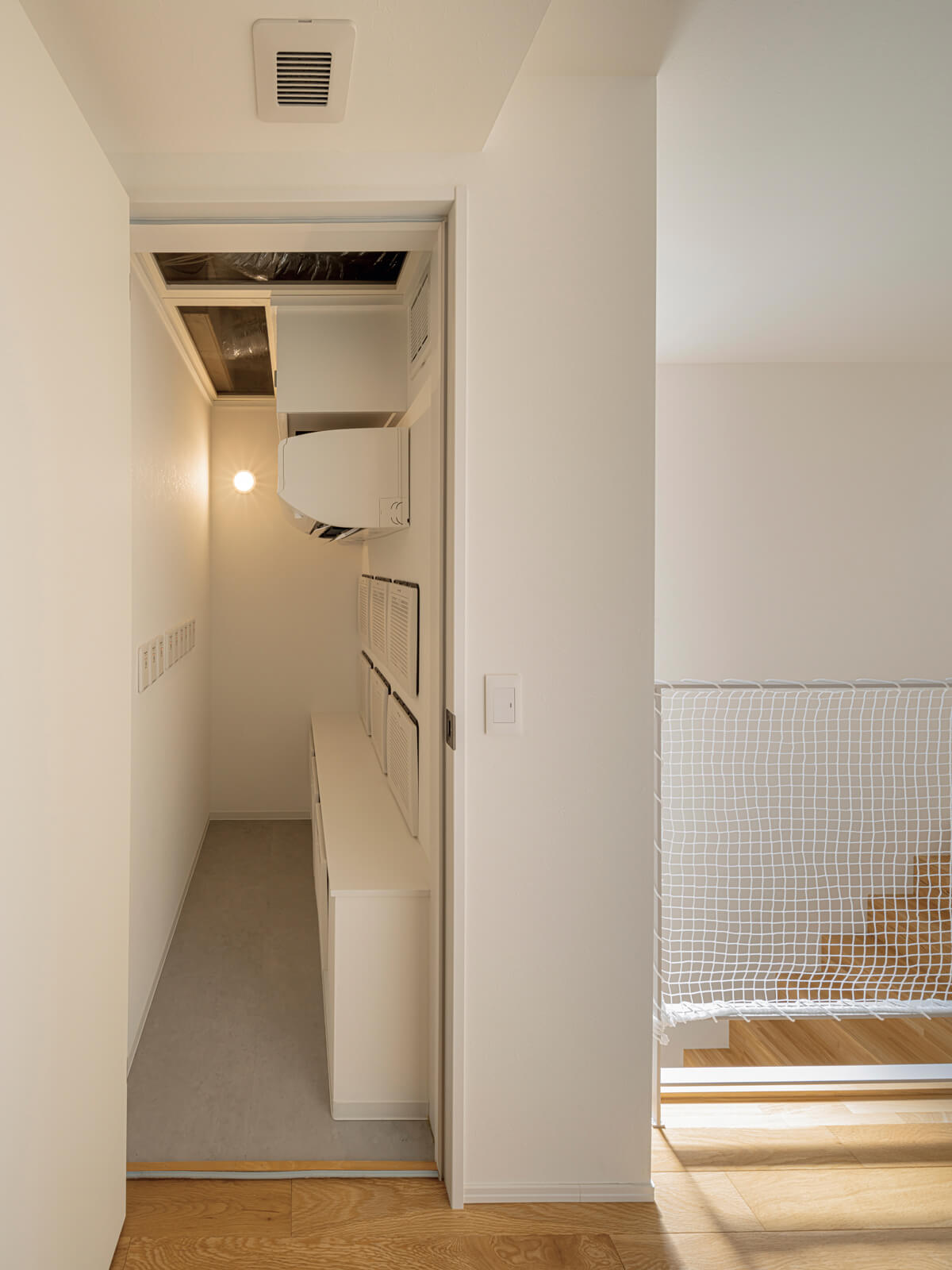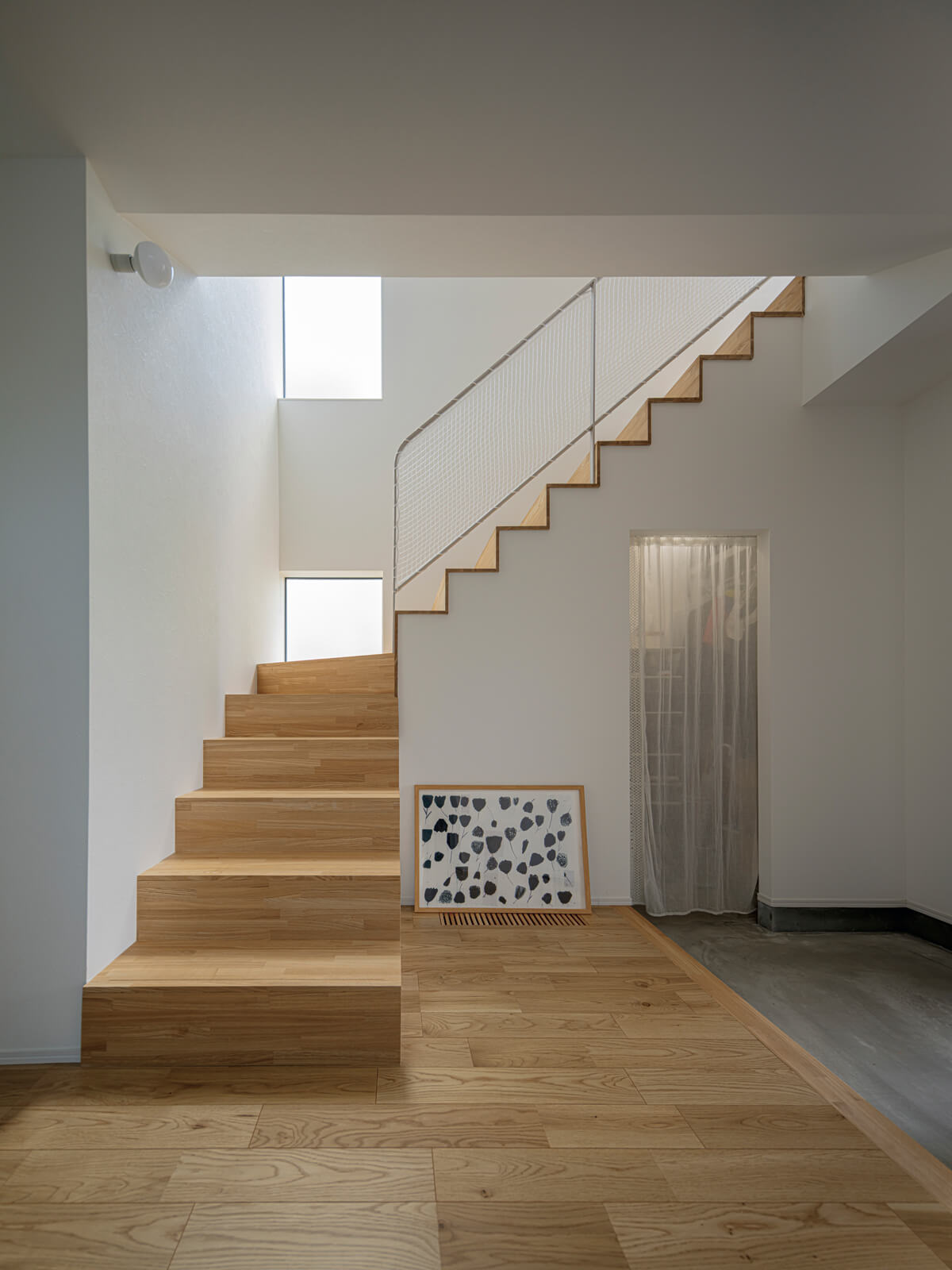 | 玄関を開けると目に飛び込んでくるのが、光と影のコントラストが美しい造作階段。フロストガラスの採光窓と地窓を踊り場に設けた階段は、踏み板の厚み、蹴り上げの高さ、手すりのアールなど細部にまでこだわり抜いた。階段下はシューズクローゼットを兼ねた収納スペースで、空間を無駄なく活用し、コンパクトな玄関まわりに美しさとゆとりを与えている。「階段吹き抜けに面する2階床には、子どものおもちゃの転落ガードをつけてくれました。設計者のきめ細かな気遣いの積み重ねも、住みやすさにつながっていると思います」(Sさん) |