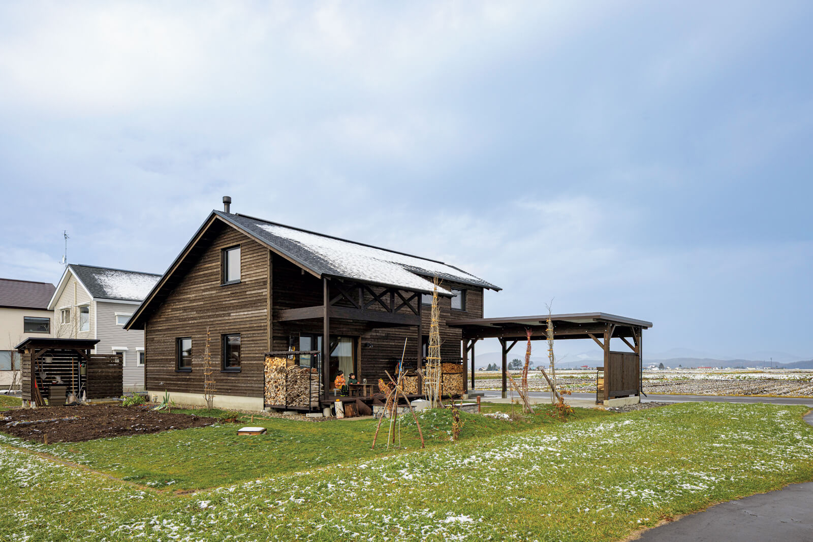 田園が銀世界に包まれた12月に新居が完成。ナラフローリングの床、ラワンに似たニヤトーリブパネルの屋根なり天井、珪藻土の壁。自然素材のテクスチャーが生きる空間には、緻密な照明計画が施され、繊細な陰影が奥行きのある表情を演出しています。