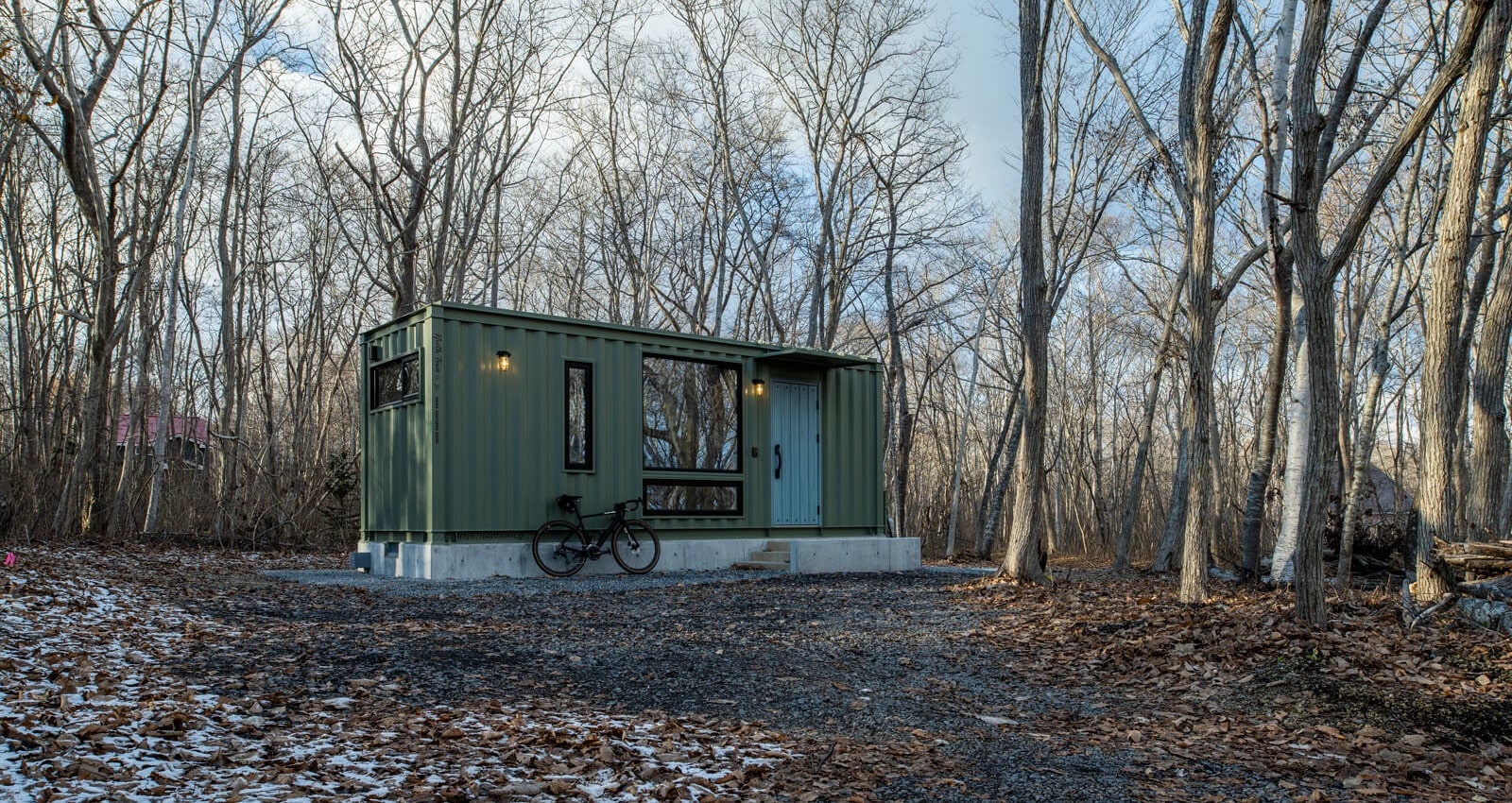 大沼公園に隣接する別荘地の森にたたずむオリーブグリーンのコンテナハウスは、静岡県在住のオーナーが、移住の住まいとして購入したものです。国内製造のJIS規格コンテナを用いた5.3坪のミニマムな空間には、水洗トイレとシャワーブース、寒冷地用エアコン、ガスボイラー、造作の水場とロフト式ベッドを完備。さらに、トリプルガラスと断熱ドアを採用し、内壁にはウレタンを吹き付け、低炭素住宅の基準をクリアする性能も備えています。2025年秋から12月までモデルハウスとしても公開され、これまでにない家づくりの提案と注目されました。