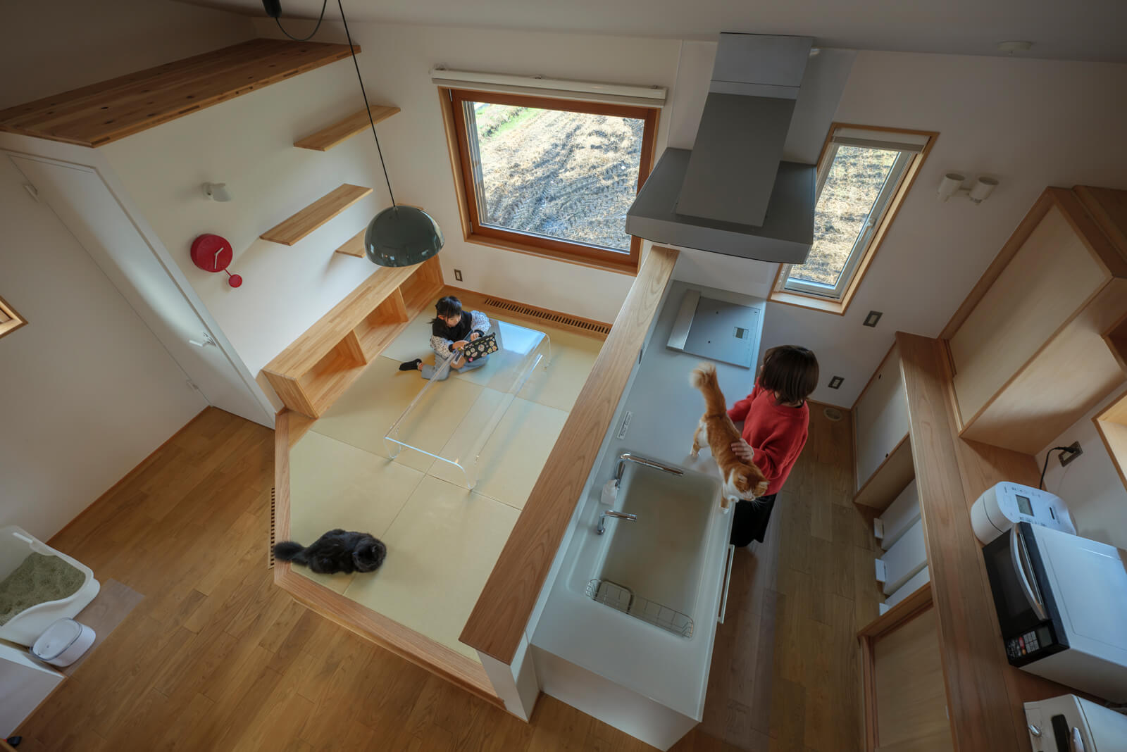 同社が建てる住宅の基本性能は耐震等級3、UA値0.32以下、C値0.5以下で、次世代省エネ基準で建てた住宅の1/2以下の暖房費を実現します。暖房にはヒートポンプ式温水パネルヒーターまたは床下エアコンによる輻射熱を利用。気流がないので空気の乾燥を軽減し、風が肌に当たる不快感がありません。快適な住み心地の実現には、ほかにも間取りや素材、採光、室内からの景観、外構などの要素が大切です。どの要素も高いレベルで実現する同社の設計力は、Aさん宅にも遺憾なく発揮されています。
