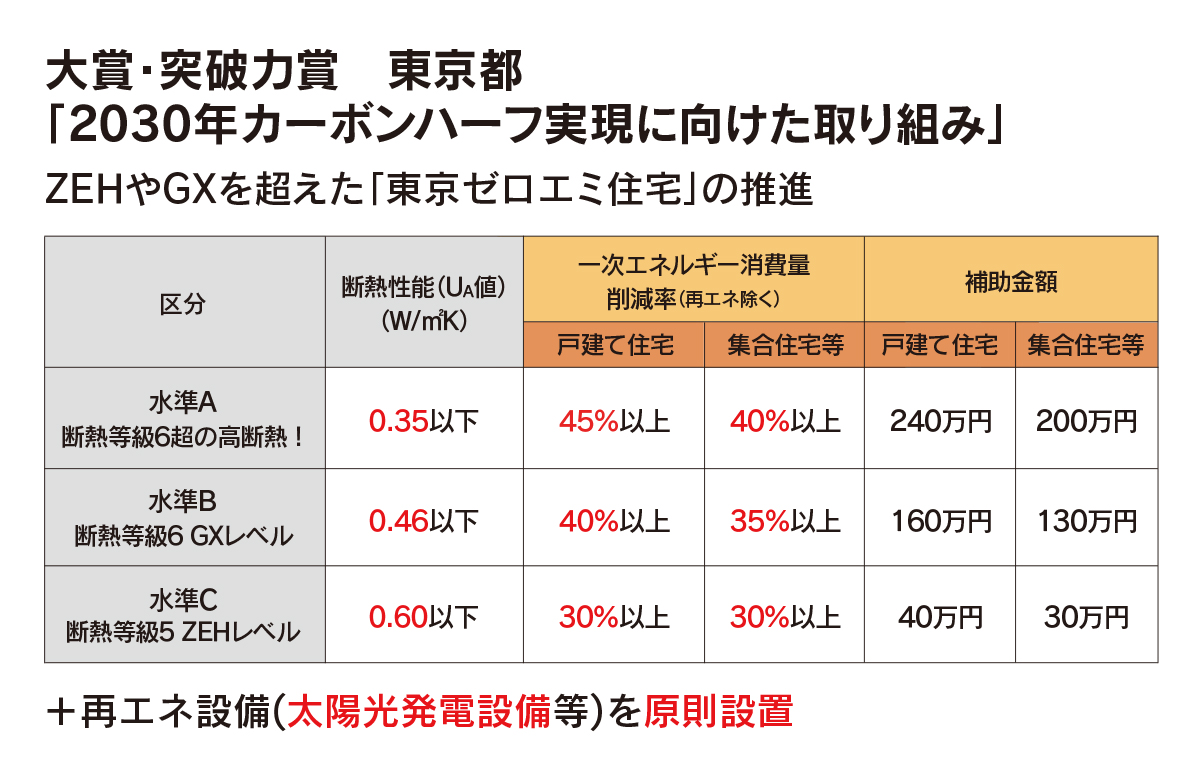 もう1つの大賞を受賞した東京都は、2030年にCO₂排出量を2000年比で半分に減らすカーボンハーフを目標に、CO₂の7割以上を排出する住宅・建築物の脱炭素化を進めています。2025年4月から始まった住宅への太陽光発電の設置義務化は、大きな話題となりました。