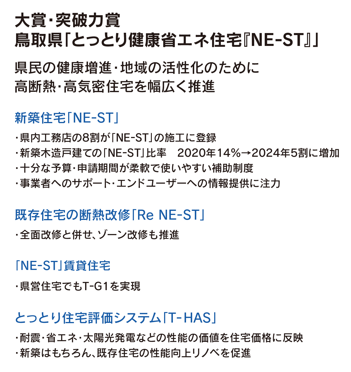 こうした取り組みのかいあって、鳥取県内では新築戸建ての5割超がすでに「NE-ST」に。まさに大賞にふさわしい「鳥取の奇跡」といえます。人口最小県であっても、熱意と創意工夫があれば、素晴らしい住宅政策を実現できることを見事に証明してくれました。県民みんなが幸せになる鳥取の成功事例、ぜひ全国に広がってほしいものですね。