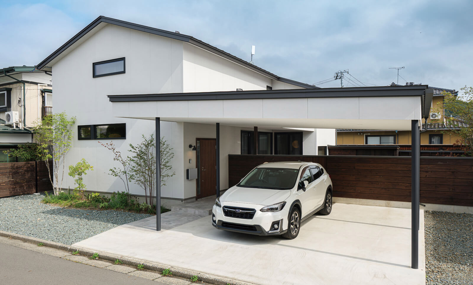 完成した住宅は、玄関アプローチとガレージを一体化させて、雨や雪の影響を受けずに車に乗り込めるよう配慮。また、木塀に囲われた庭をガレージの奥に配置することで、よりプライベートの時間を楽しみやすい庭になりました。