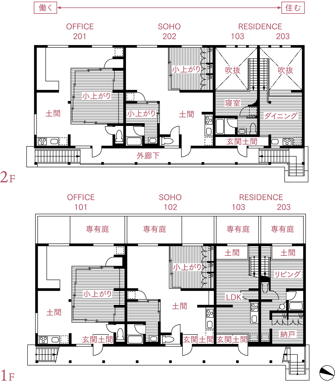 設計の軸としたのは、暮らしと外部環境との交わり方の「濃度」です。住宅、SOHO、事務所が同居するこの建築では、暮らしの「濃度」がグラデーションのように変わる部屋構成を意識して設計し、プライバシーを保ちつつも、利用者が緩やかにつながり合える「結節点(node)」となることを目指しました。