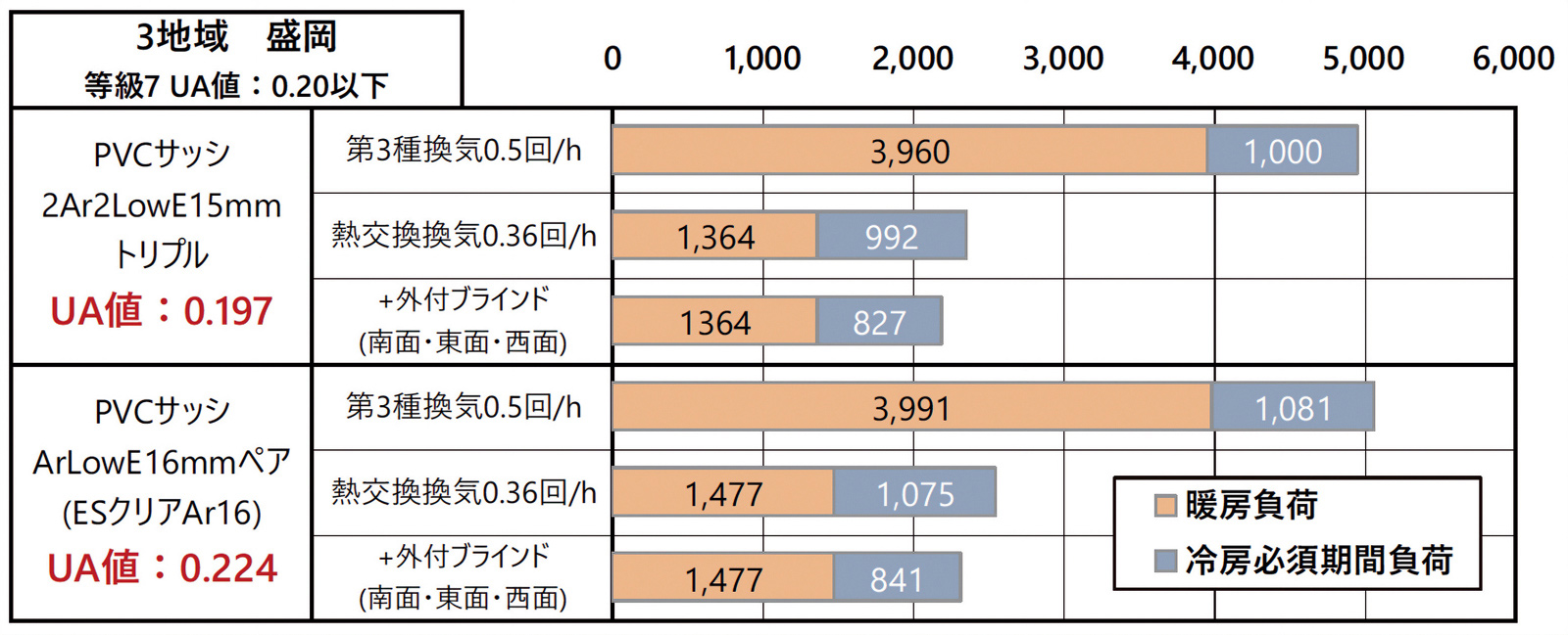 主としてUA値で規定される省エネ基準住宅では、換気の熱損失はUA値に算入されないため、熱交換換気を採用するかどうかで、大幅に暖房エネルギーが変わります。第3種換気で、盛岡で約3倍、練馬では約5倍にも増えるのです。 冷房のエネルギーは、窓の日射遮蔽の有無で変わりますが、これもUA値には関係ありません。また、開口部のトリプルガラスを、最近の新型ペアガラスに変えると、UA値は大きく増え、等級7をクリアできなくなりますが、開口部からの日射取得が増えて、暖房エネルギーはあまり変わりません。特に5~7地域の日射量が大きい地域では暖房エネルギーはむしろ小さくなります。