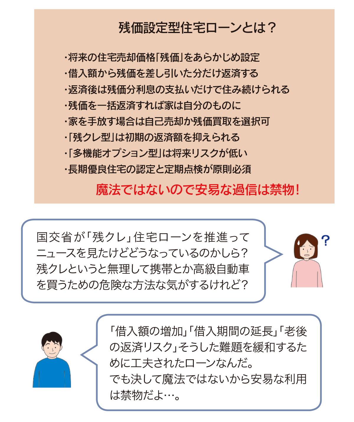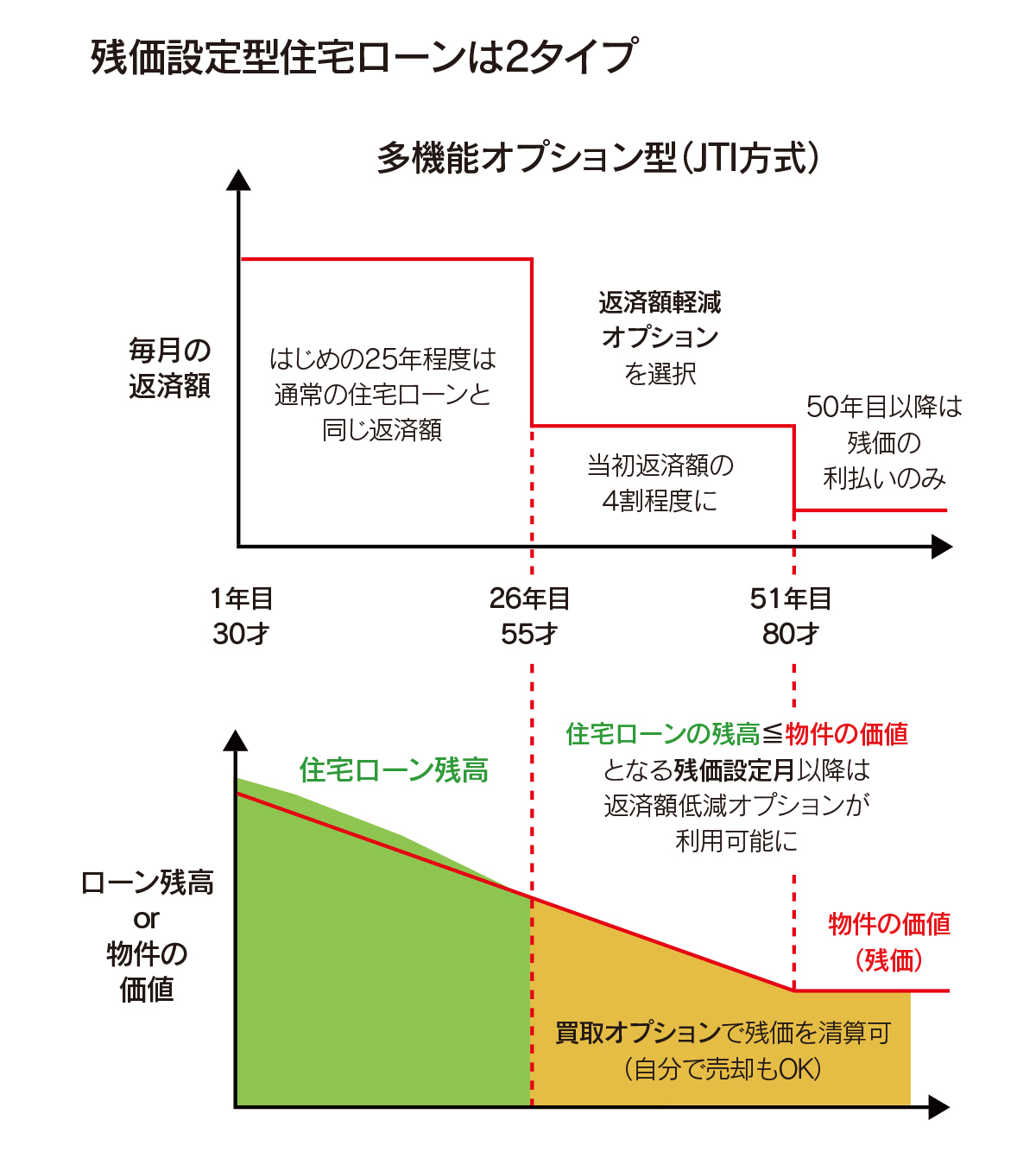 「残価設定型住宅ローン」には、JTI(一般社団法人移住・住みかえ支援機構)が提供している「多機能オプション型」と、受託金融支援機構が3月から提供予定とされる「残クレ型」の2タイプがあります。前者は後半のリスクが小さい、後者は前半の返済額が小さいという特徴があるようです。