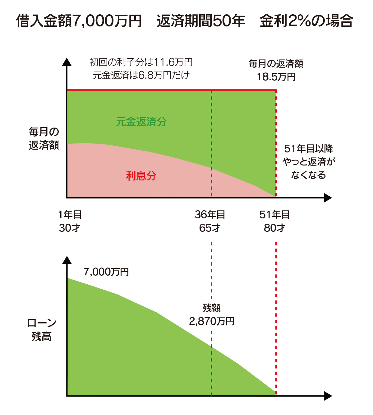前述のとおり、借入期間はバブル崩壊前は20~25年だったものが、デフレ期は35年に延びました。さらに50年まで延長となると、人生の大半をローン返済に充てることになります。そのリスクを確認してみましょう(図4)。
