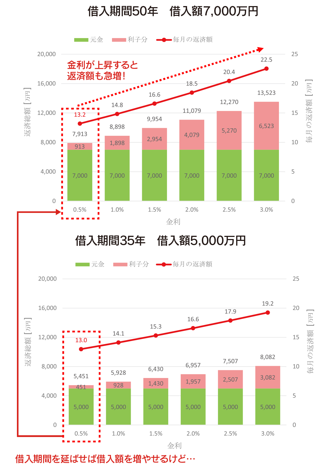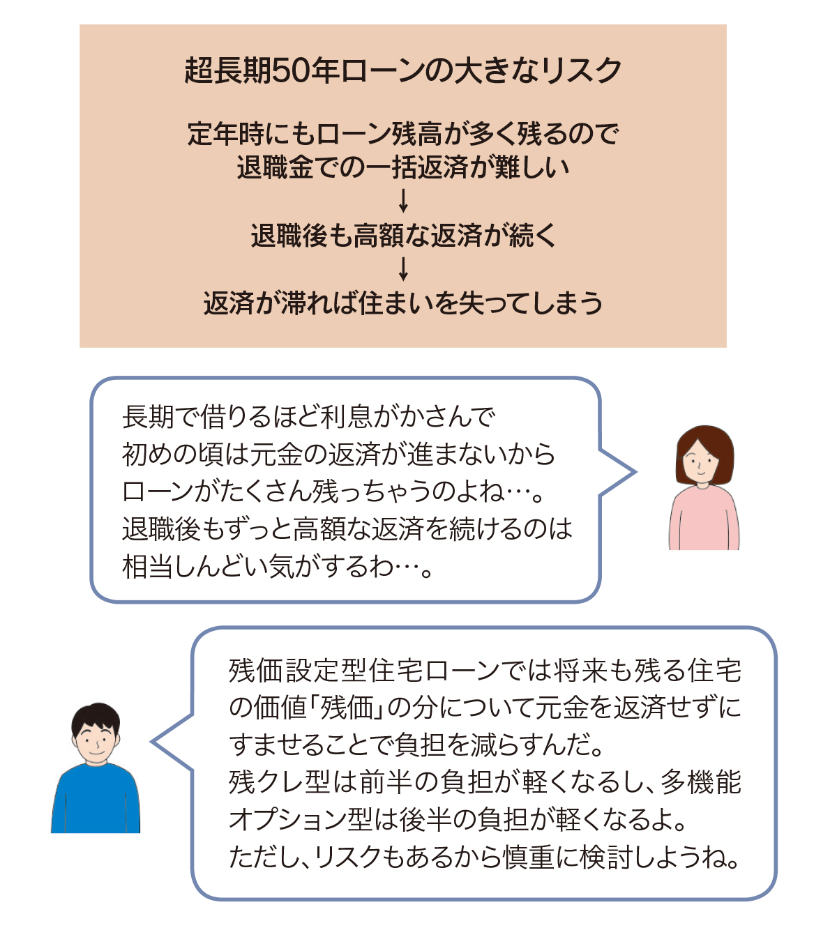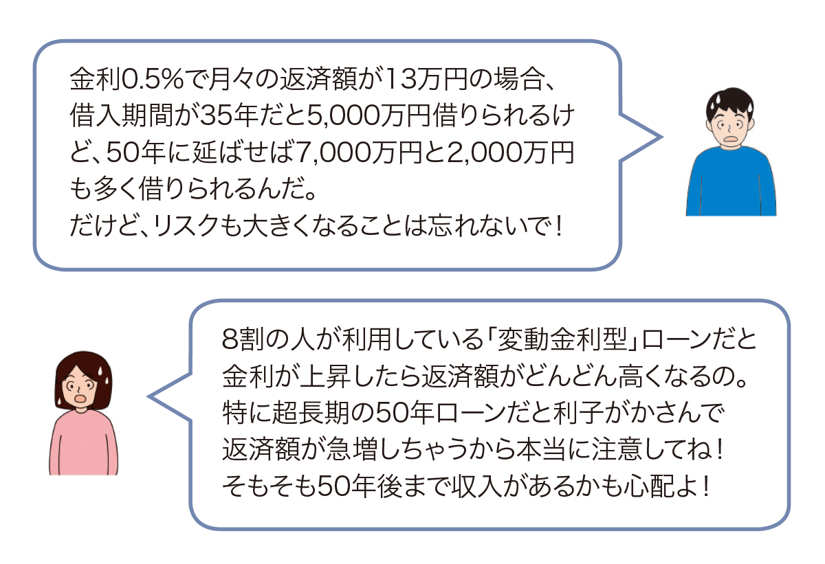 50年も先の未来を正確に予測することは不可能です。一方でかつてバブル崩壊後に多くの人が住宅ローン返済が滞り苦しんだことも事実です。変動金利型で借入期間が延びるリスクは、いま一度よく考えた方がよさそうです。