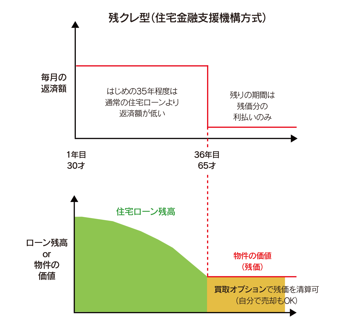返済終了後にも残価分の借り入れは残ることになりますが、少額の残価分金利さえ払えば、家にずっと住み続けることができます。最後には、自分で家を売るか残価で買い取ってもらう(買取オプション)かを選ぶことができます。
