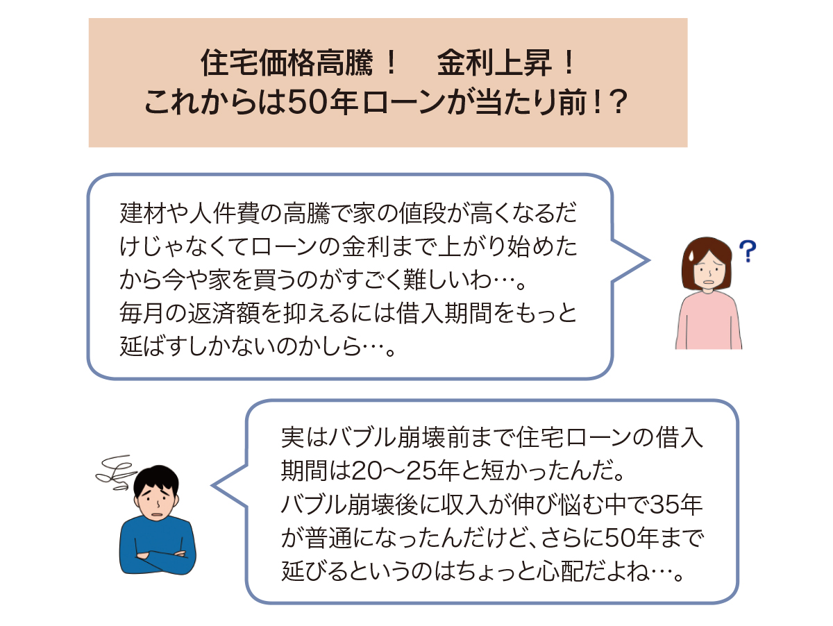 さらに2009年からは、借入期間が50年まで延長された全期間固定金利型「フラット50」が登場しました。同年には、100年使用できる耐震性・耐久性・省エネ性を標ぼうする「長期優良住宅」が登場しており、建物の長寿命化に合わせてローンのさらなる長期化が始まります。昨今の住宅価格高騰と金利上昇に合わせて、変動金利型でも50年ローンが標準になりつつあるのが現状です。