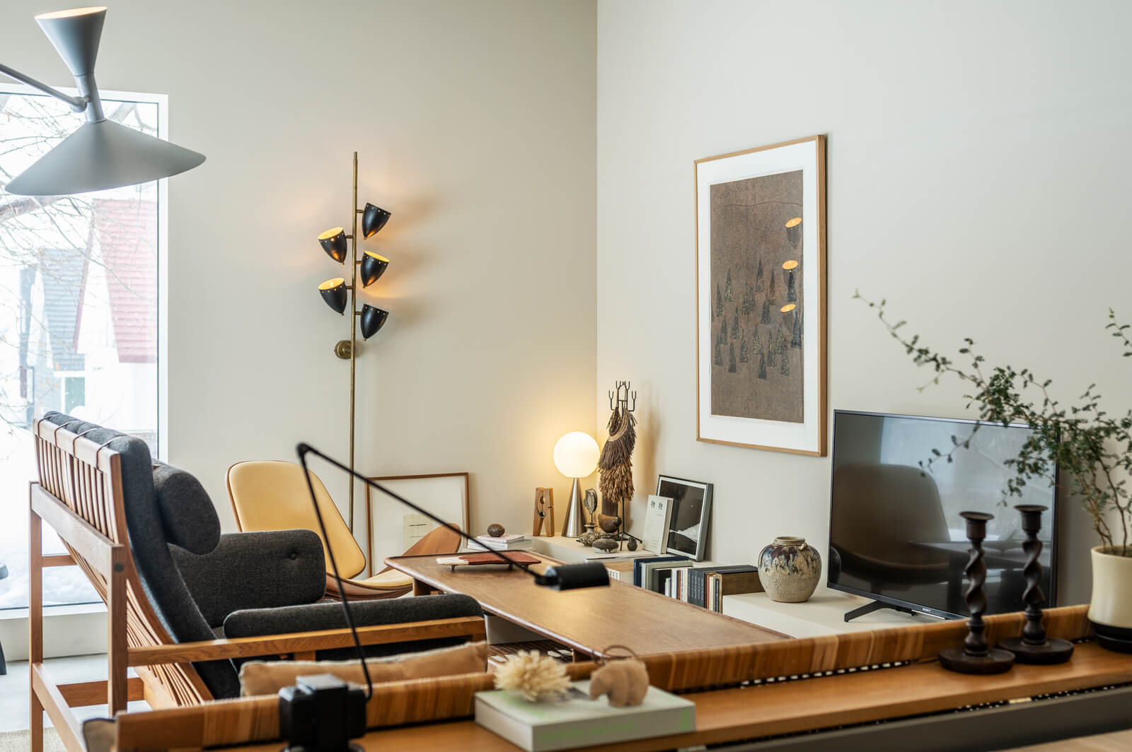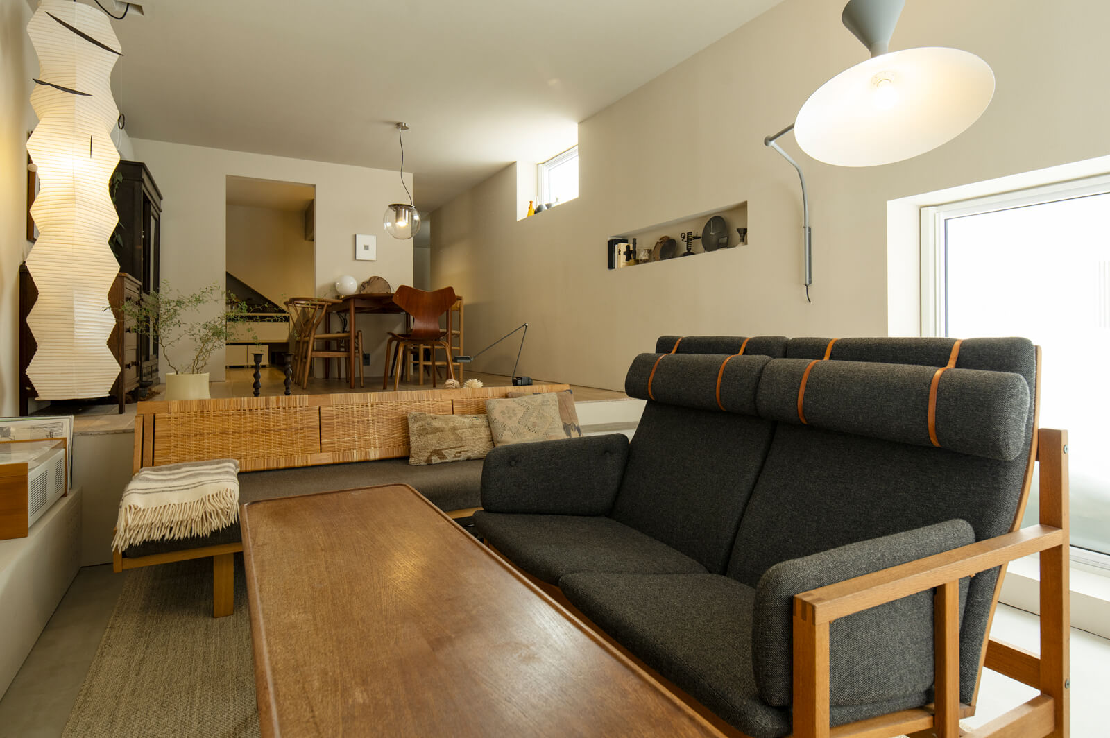 リビングの空間デザインの核は、モーエンセンの2シーターソファとウェグナーのデイベッド。可動式ネックレストが機能美を湛えるソファ、籐編みの背もたれをスライドさせるとベッドへと姿を変えるデイベッドは、いずれも10年ほど前にインターネットで見つけたビンテージ品です。